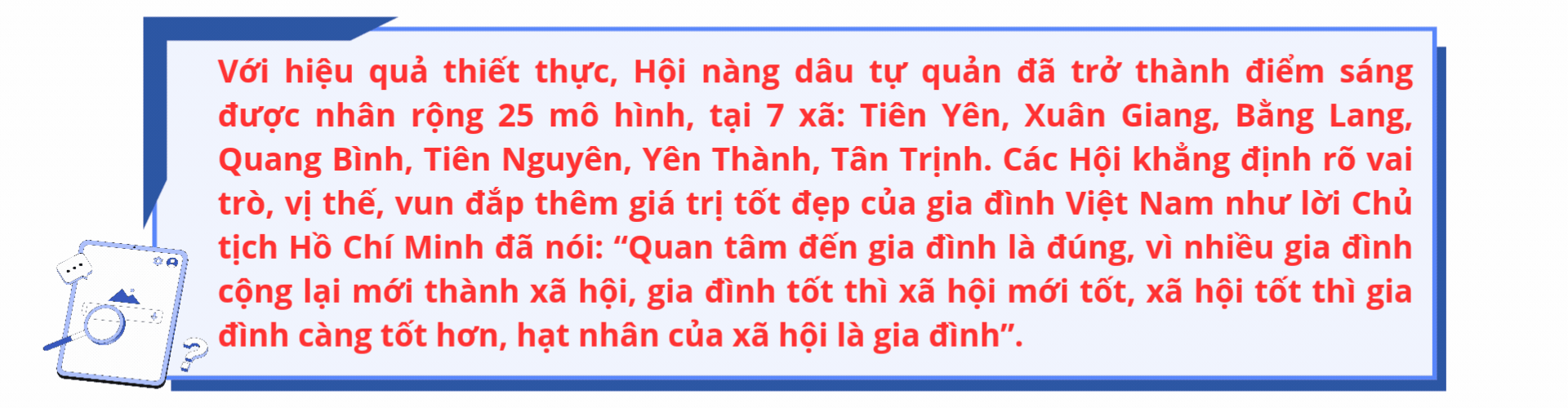 Ngược lại, nàng dâu Nguyễn Thị Thoa mang đến năng lượng trẻ, sáng kiến mới trong tuyên truyền phòng, chống bạo lực gia đình, tệ nạn xã hội, vận động các hộ thực hiện nếp sống văn minh trong cưới xin, tang ma, lễ hội. Những câu chuyện tưởng chừng rất nhỏ trong mái ấm được hai thế hệ tôn trọng, lắng nghe, chia sẻ và cảm thông.