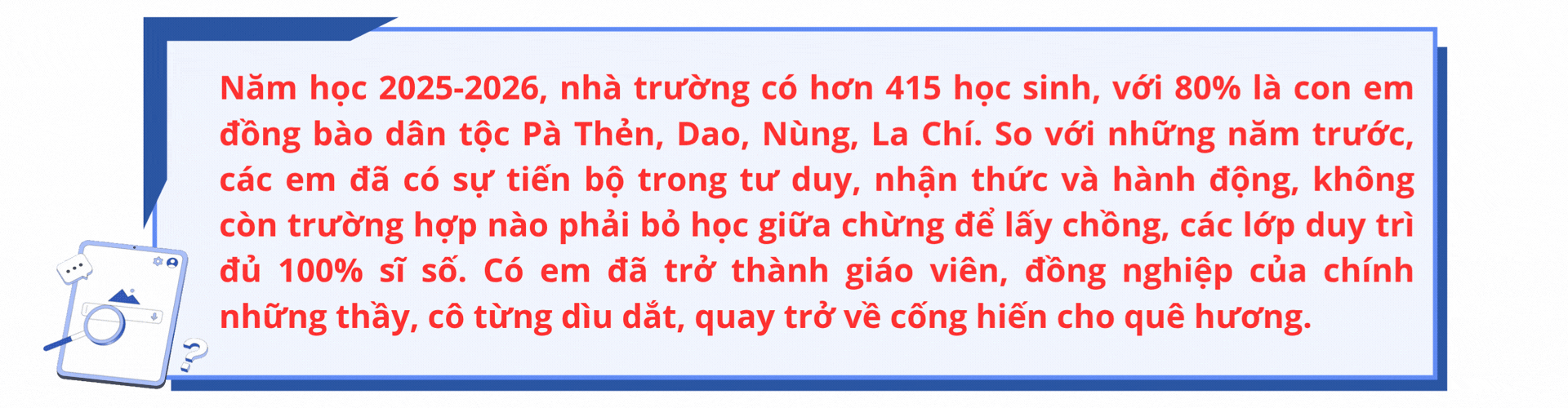 Từ nhận thức ấy, chính các em lại trở thành những “tuyên truyền viên nhỏ tuổi”. Trong giờ ra chơi, trong những buổi sinh hoạt lớp, các em mạnh dạn chia sẻ với bạn bè về tác hại của tảo hôn, về quyền được học tập, được lựa chọn của mỗi người. Những lời nói giản dị, chân thành đã dần lan tỏa, góp phần thay đổi suy nghĩ của nhiều học sinh cùng trang lứa.