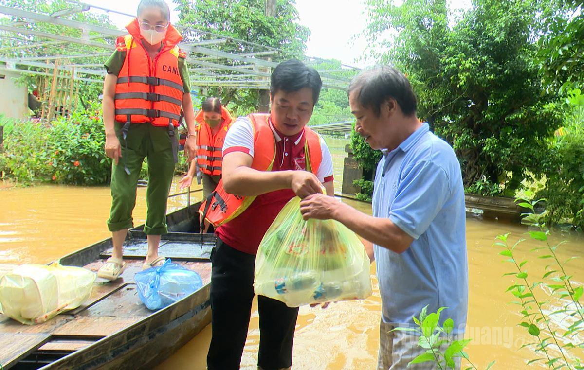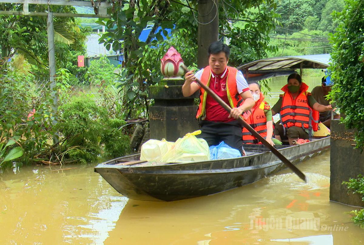 Lực lượng Công an và các thành viên CLB Thiện nguyện Na Hang dùng thuyền nhỏ tiếp cận các khu vực nước dâng cao, bị cô lập. |