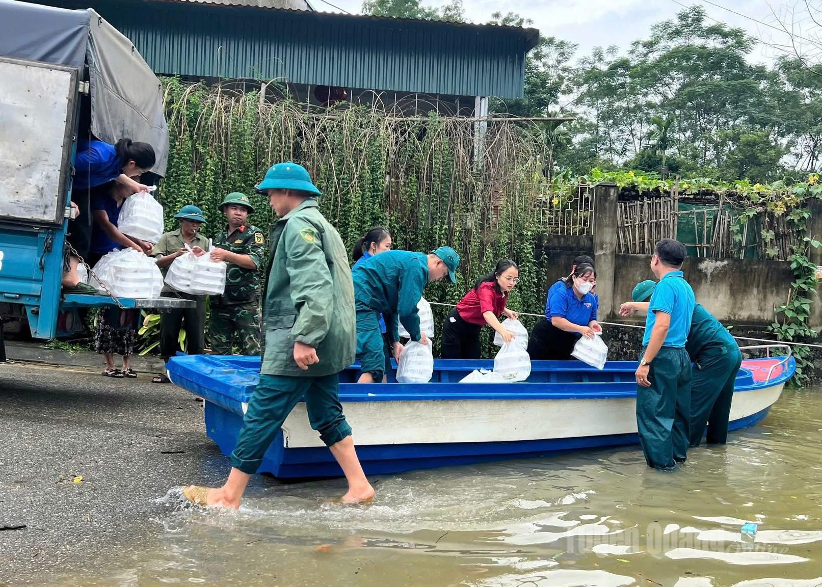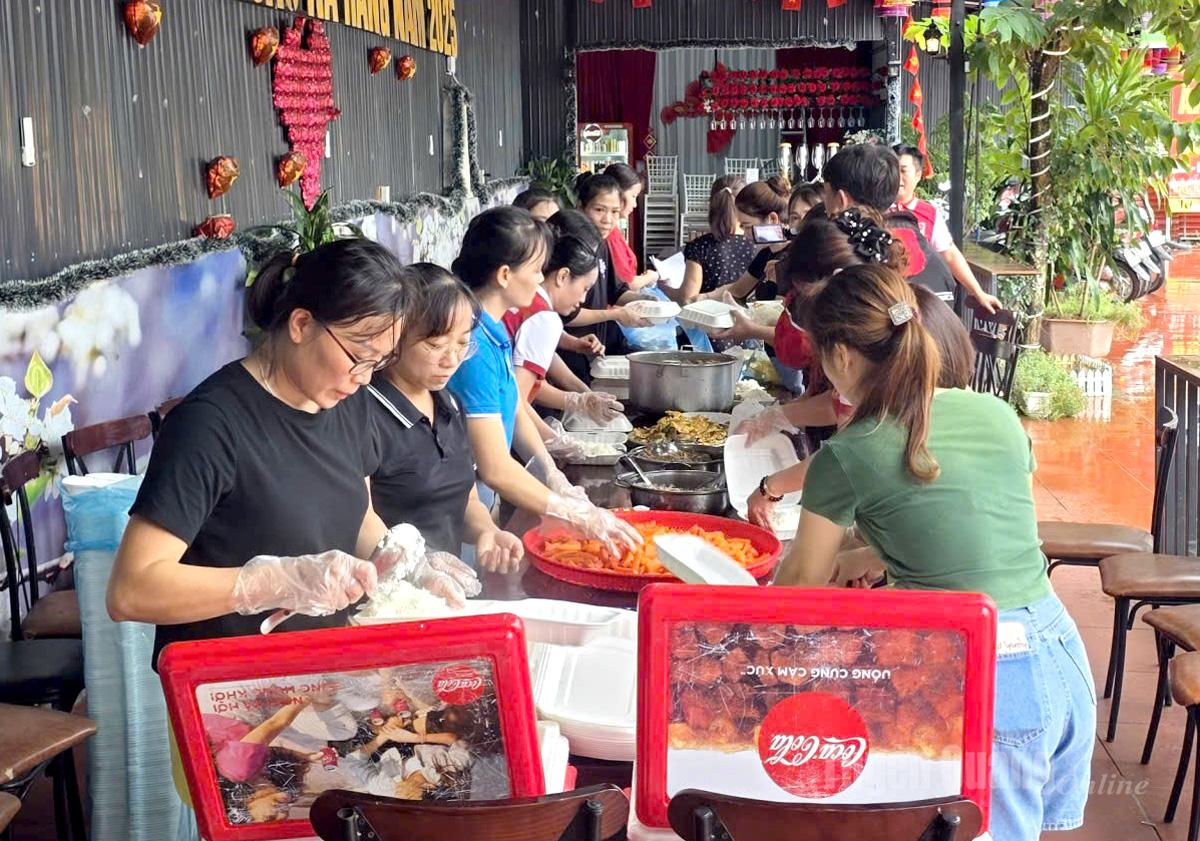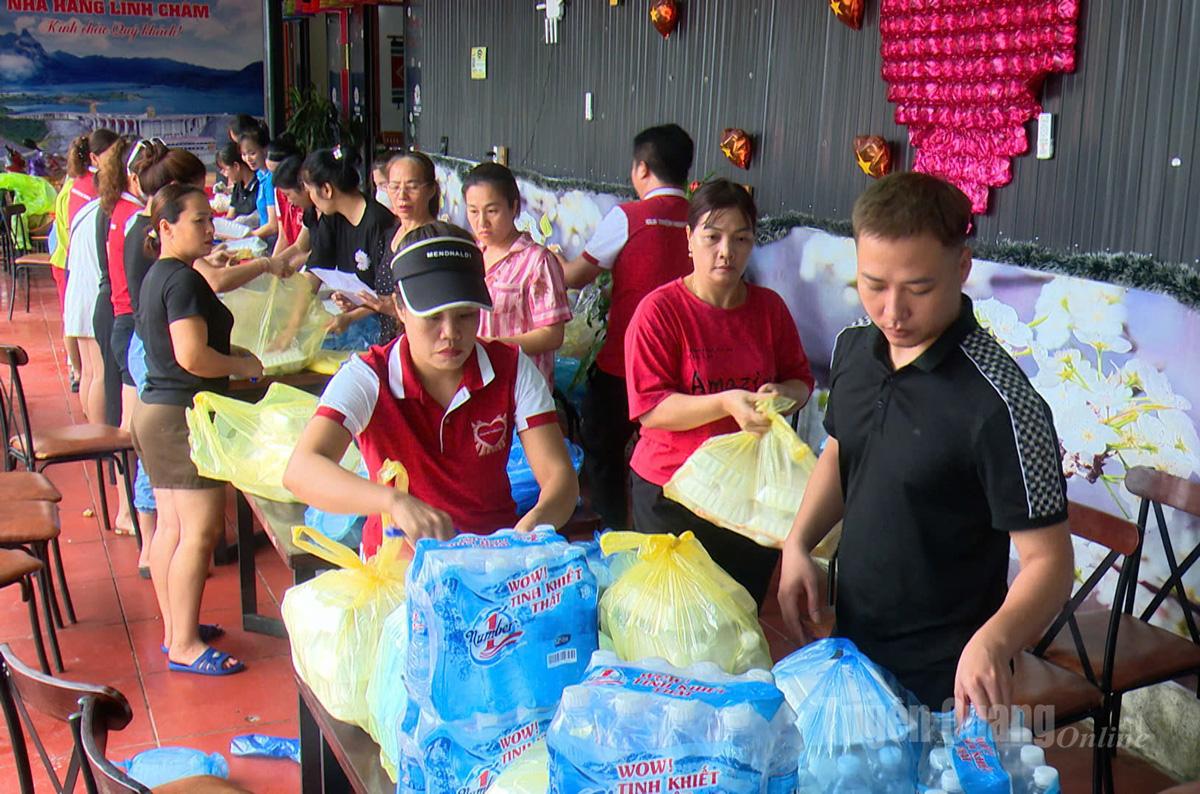Mỗi người một việc, người nấu, người đóng hộp, người lội nước mang cơm đến từng hộ gia đình bị cô lập. Phía sau những suất cơm là tinh thần "tương thân tương ái" được phát huy mạnh mẽ trong bão lũ.