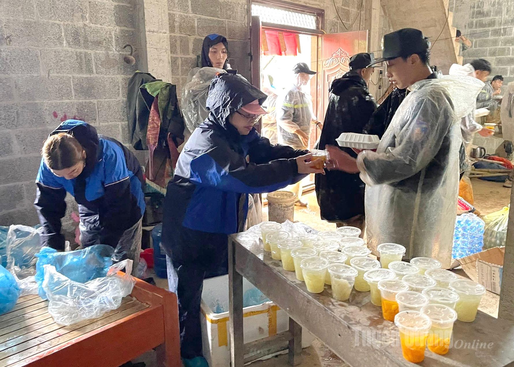 Những suất cơm ấm lòng được trao tận tay lực lượng cứu hộ tại xã Lũng Cú. |