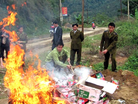 Đội QLTT số 5 (huyện Xín Mần) tiêu hủy hàng giả, hàng kém chất lượng .