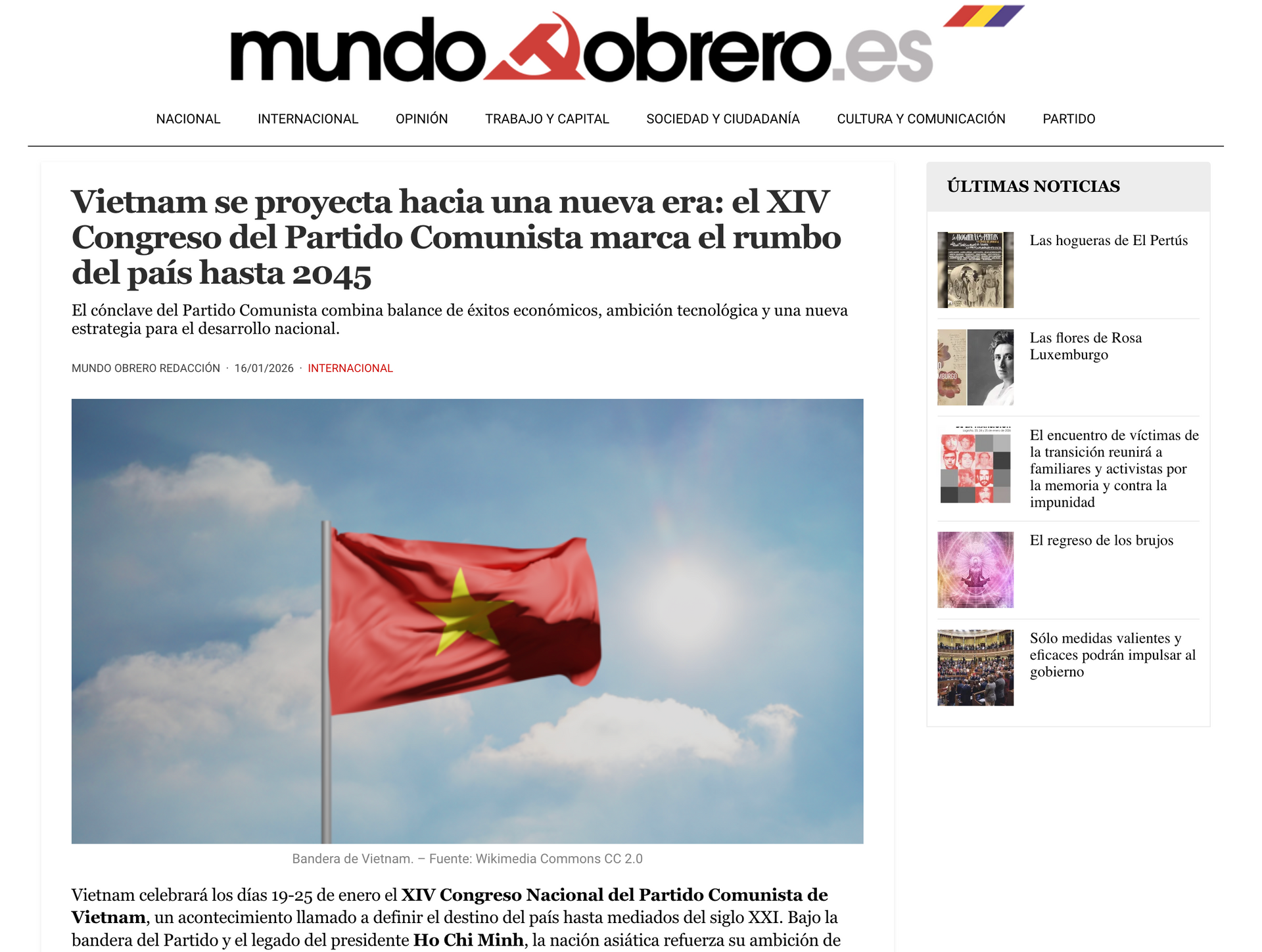 | Báo Mundo Obrero (Tây Ban Nha) viết về Đại hội XIV của Đảng. Ảnh chụp màn hình |