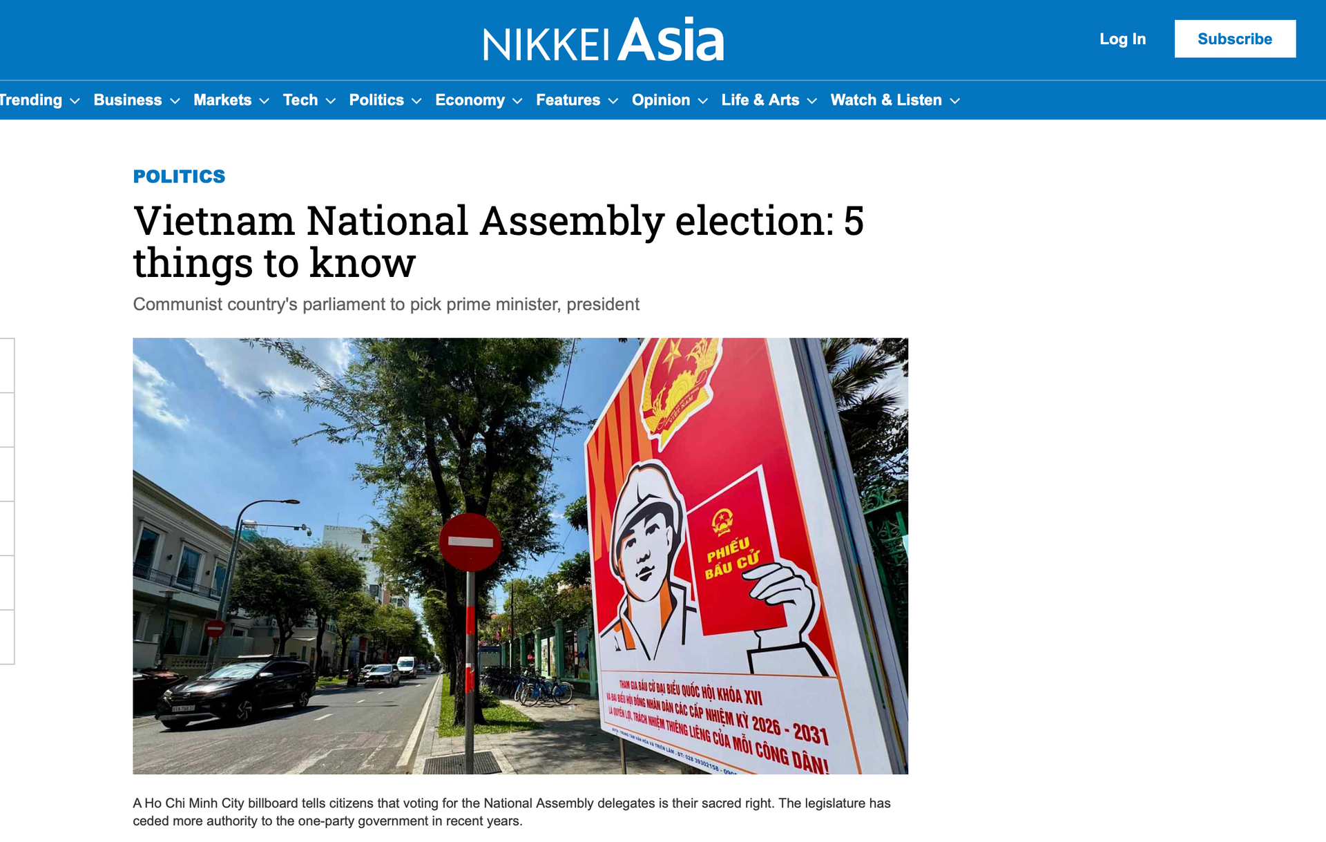 | Bài viết về bầu cử của Việt Nam trên Nikkei Asia. Ảnh chụp màn hình. |
