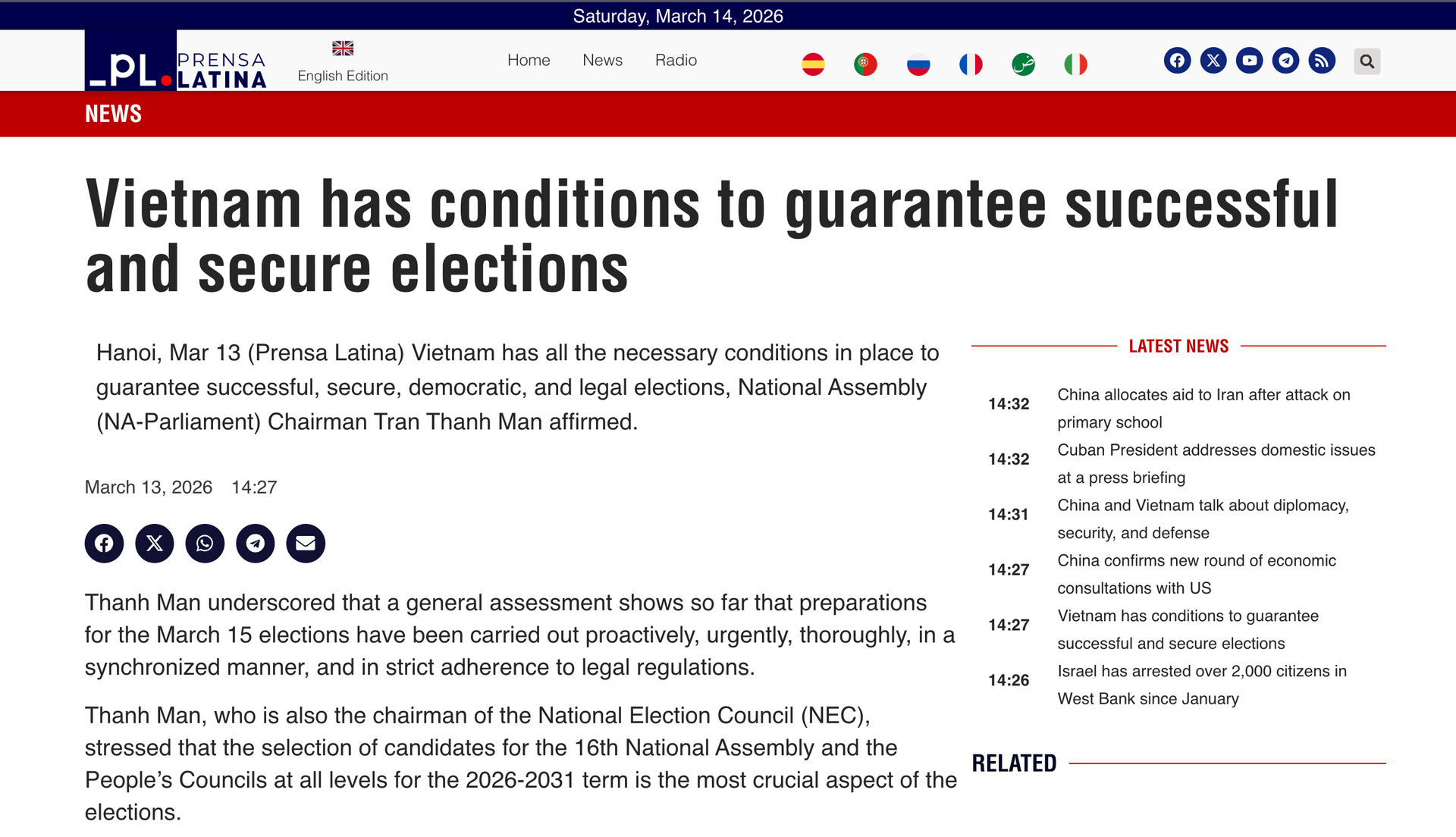 | Tin tức về bầu cử của Việt Nam trên Prensa Latina. Ảnh chụp màn hình. |