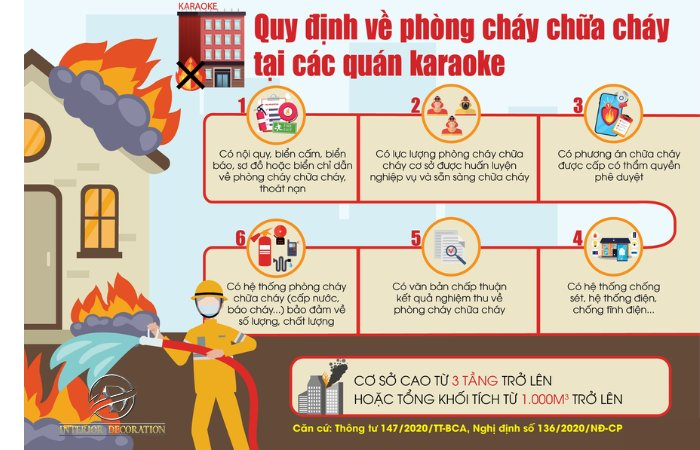 Kể từ năm 2018, các quy định và yêu cầu PCCC trở nên nghiêm ngặt hơn với các cơ sở kinh doanh karaoke. Bên cạnh việc đảm bảo hệ thống phòng cháy, các quán hát cần có lối thoát hiểm và thang thoát hiểm độc lập để đảm bảo an toàn trong trường hợp xảy ra hỏa hoạn hoặc sự cố cháy nổ.