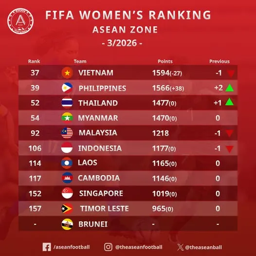 Thầy trò HLV Mai Đức Chung bị trừ 27 điểm từ thành tích không tốt ở Asian Cup 2026 mới đây, ở giải đấu mà đội tuyển nữ Việt Nam dù thắng Ấn Độ ở trận ra quân nhưng sau đó đã để thua Đài Bắc Trung Hoa và Nhật Bản. Số điểm hiện có của các cô gái Việt Nam là 1594 điểm.