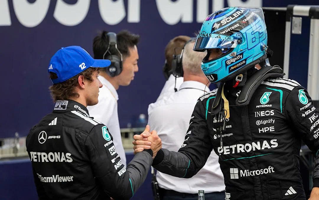 | Hai tay đua của đội Mercedes - Kimi Antonelli (trái) và George Russell - ăn mừng sau chiến thắng tại vòng phân hạng chặng đua Australian Grand Prix ngày 7-3. Ảnh: mercedesamgf1.com |