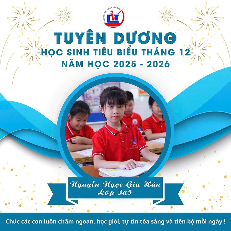 | Em Nguyễn Ngọc Gia Hân, lớp 3A5 được tuyên dương học sinh tiêu biểu của trường Tiểu học Lê Văn Tám. |