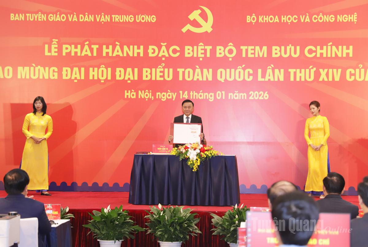 | Thường trực Ban Bí thư Trần Cẩm Tú ký phát hành bộ tem bưu chính đặc biệt chào mừng Đại hội. |