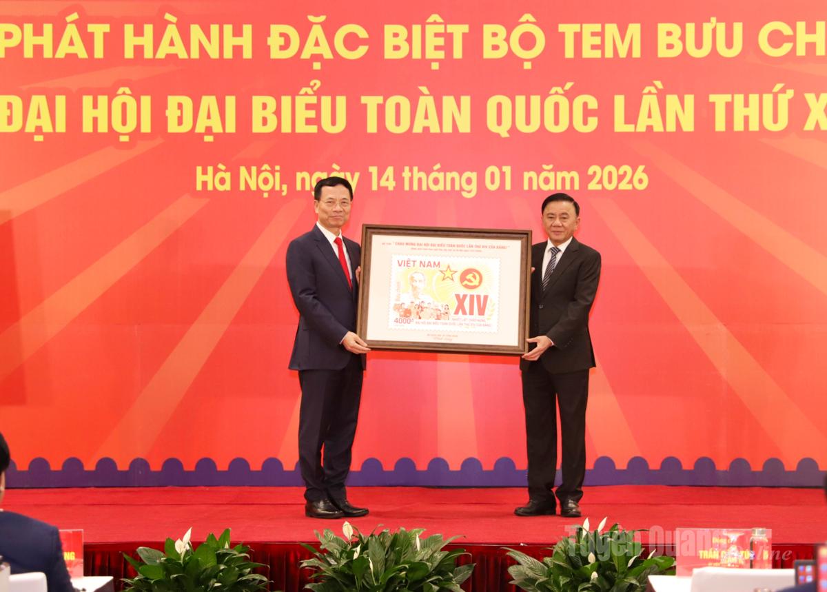 | Bộ trưởng Bộ Khoa học và Công nghệ Nguyễn Mạnh Hùng trao tặng hình ảnh bộ tem bưu chính đặc biệt chào mừng Đại hội cho Thường trực Ban Bí thư Trần Cẩm Tú. |