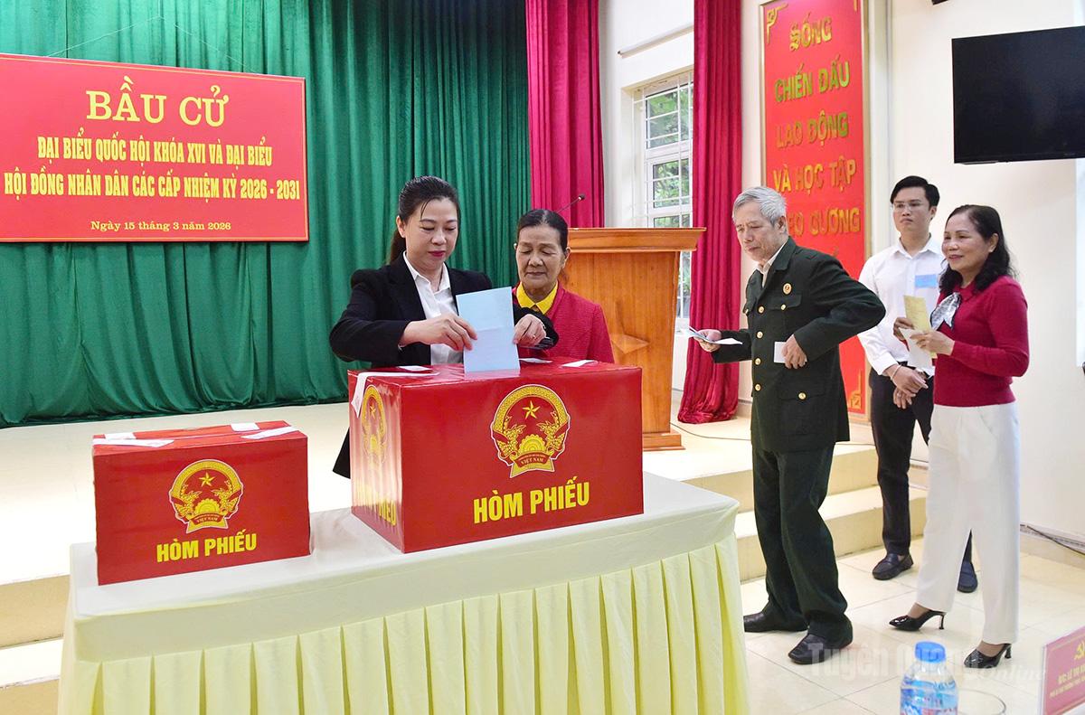 | Lãnh đạo xã Yên Minh tham gia bỏ phiếu bầu đại biểu Quốc hội khóa XVI và đại biểu HĐND các cấp nhiệm kỳ 2026 – 2031 tại khu vực bỏ phiếu số 2. Ảnh: Phạm Hoan |