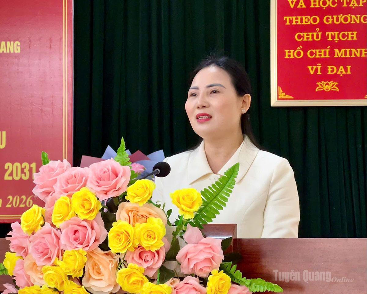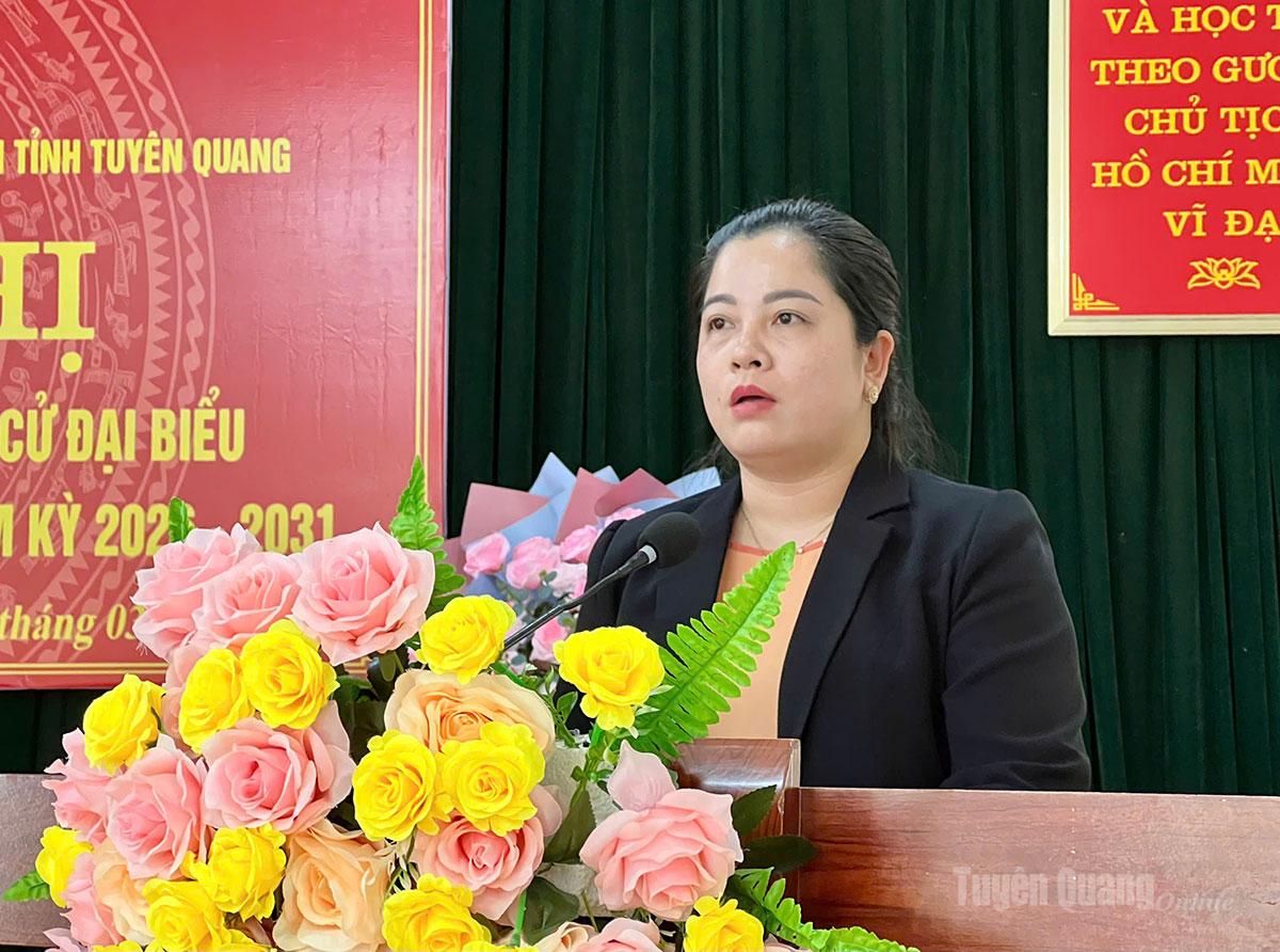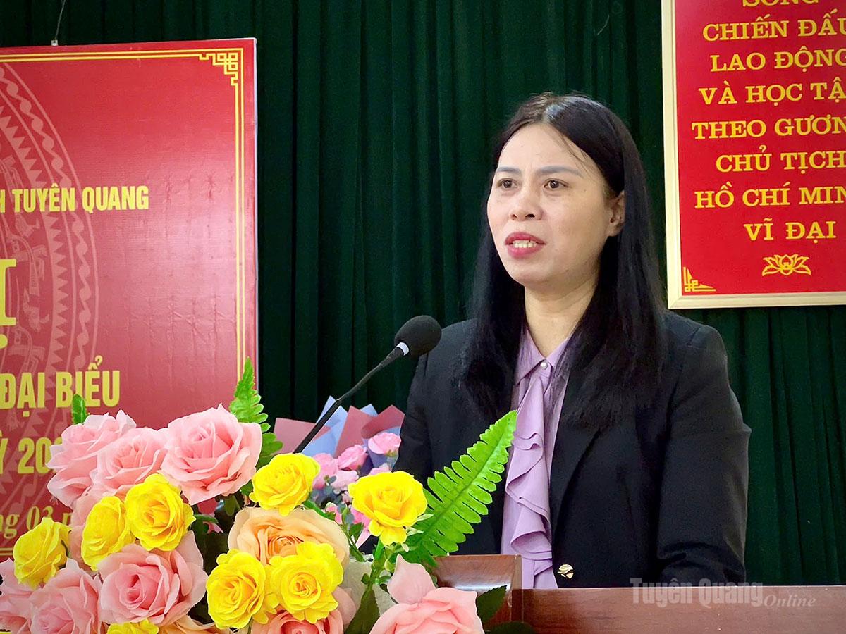 | Đồng chí Lý Thị Lan, Ủy viên BTV Tỉnh ủy, Trưởng Đoàn ĐBQH hoạt động chuyên trách khoá XV tỉnh Tuyên Quang phát biểu tại hội nghị tiếp xúc cử tri xã Thắng Mố. |
