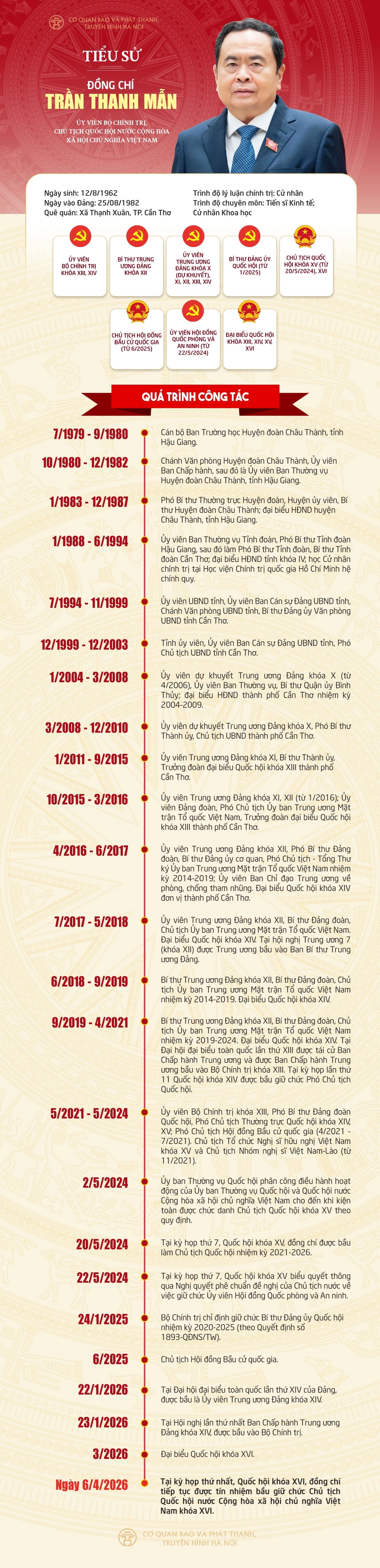 Ngày 6-4, tại kỳ họp thứ nhất, Quốc hội khóa XVI, nhiệm kỳ 2026-2031, đồng chí Trần Thanh Mẫn, Ủy viên Bộ Chính trị, Chủ tịch Quốc hội khóa XV tiếp tục được Quốc hội tín nhiệm bầu giữ chức Chủ tịch Quốc hội nước Cộng hòa xã hội chủ nghĩa Việt Nam khóa XVI.