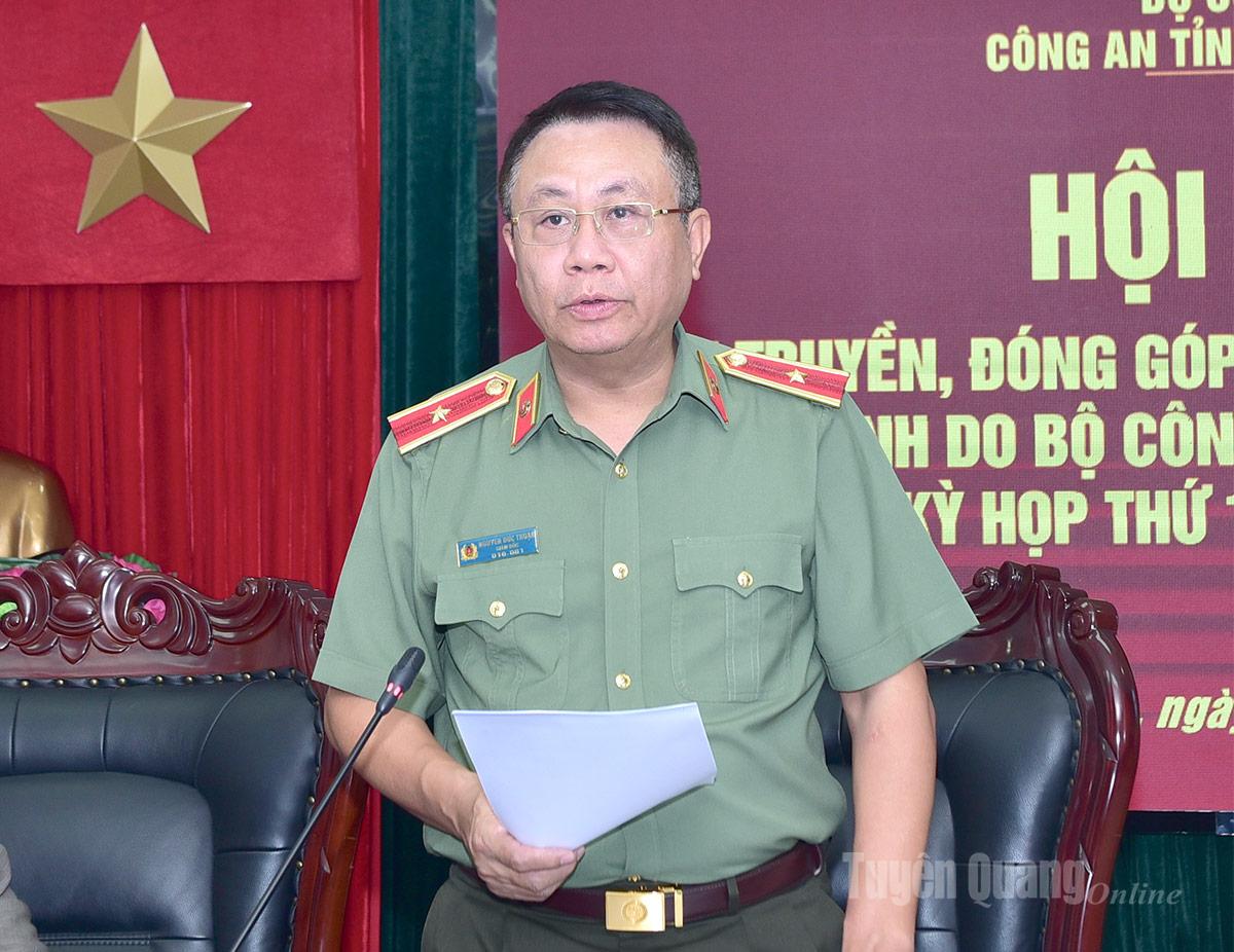 Phát biểu khai mạc hội nghị, Thiếu tướng Nguyễn Đức Thuận, Giám đốc Công an tỉnh Tuyên Quang nhấn mạnh, việc tổ chức lấy ý kiến góp ý xây dựng các dự án Luật, Pháp lệnh do Bộ Công an chủ trì soạn thảo để trình kỳ họp thứ 10, Quốc hội khóa XV là rất cần thiết, giúp lực lượng Công an chủ động trong công tác tham mưu với Đảng, Nhà nước các chủ trương, chính sách về bảo đảm an ninh, trật tự, đẩy mạnh ứng dụng khoa học, công nghệ phục vụ công cuộc chuyển đổi số quốc gia, xây dựng Chính phủ điện tử, Chính phủ số, kinh tế số, xã hội số trong tình hình hiện nay.