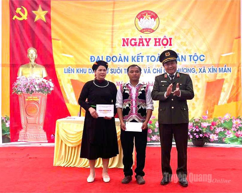 | Giám đốc Công an tỉnh Nguyễn Đức Thuận tặng quà cho Ban quản lý 2 thôn tại Ngày hội. |