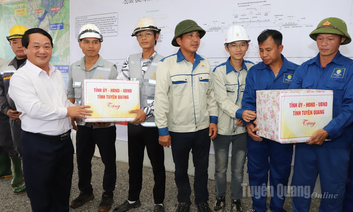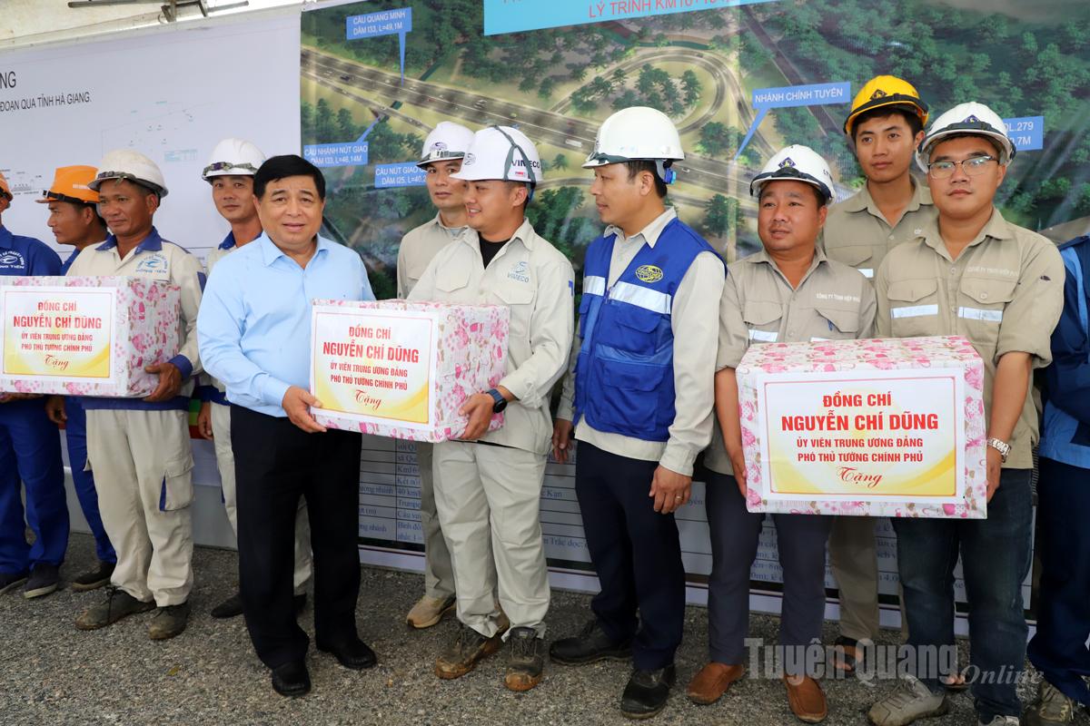 | Phó Thủ tướng Chính phủ Nguyễn Chí Dũng tặng quà các đơn vị thi công Dự án Cao tốc Tuyên Quang - Hà Giang. |