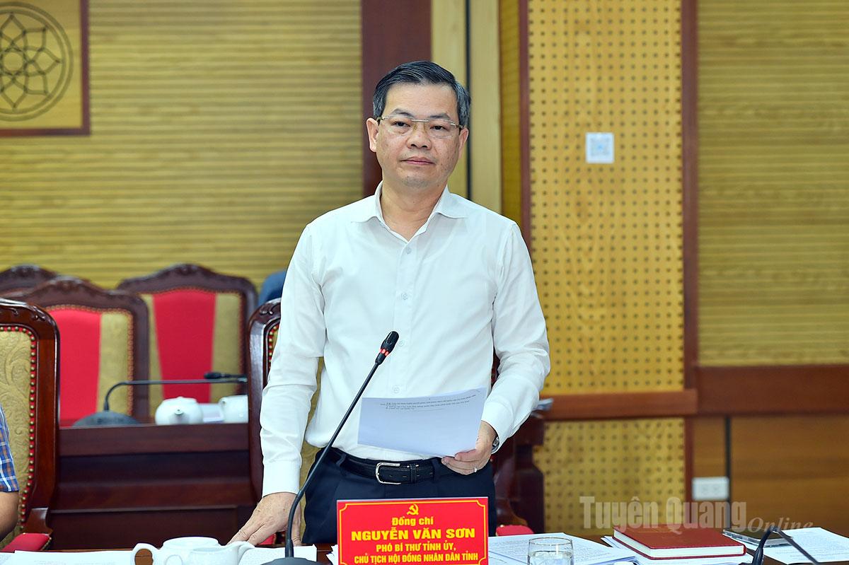| Đồng chí Phó Bí thư Tỉnh ủy, Chủ tịch HĐND tỉnh Nguyễn Văn Sơn phát biểu tại hội nghị. |