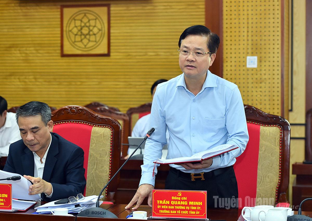 | Đồng chí Trưởng Ban Tổ chức Tỉnh ủy Trần Quang Minh phát biểu ý kiến tại hội nghị. |