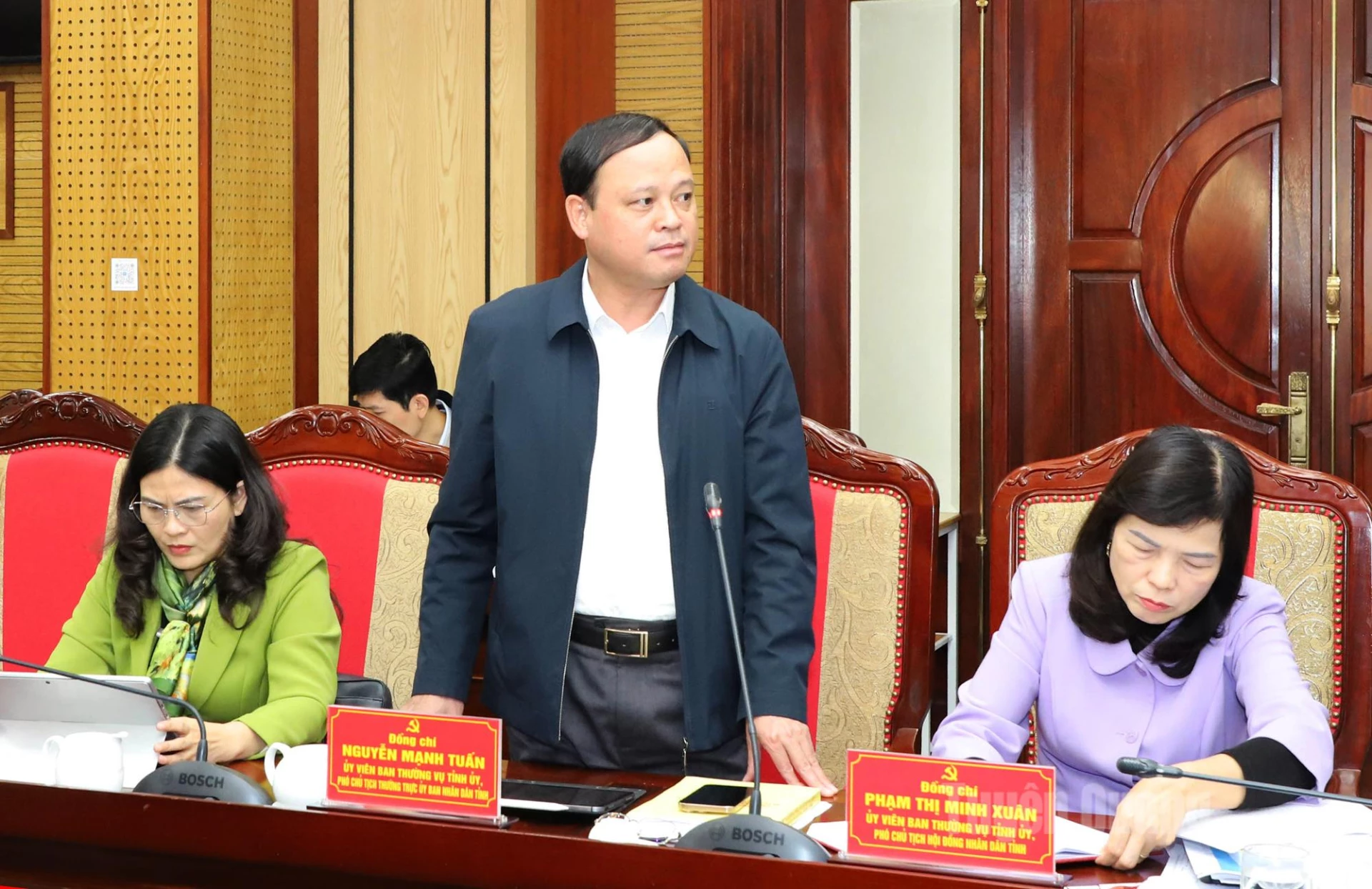 | Phó Chủ tịch Thường trực UBND tỉnh Nguyễn Mạnh Tuấn thảo luận tại hội nghị. |