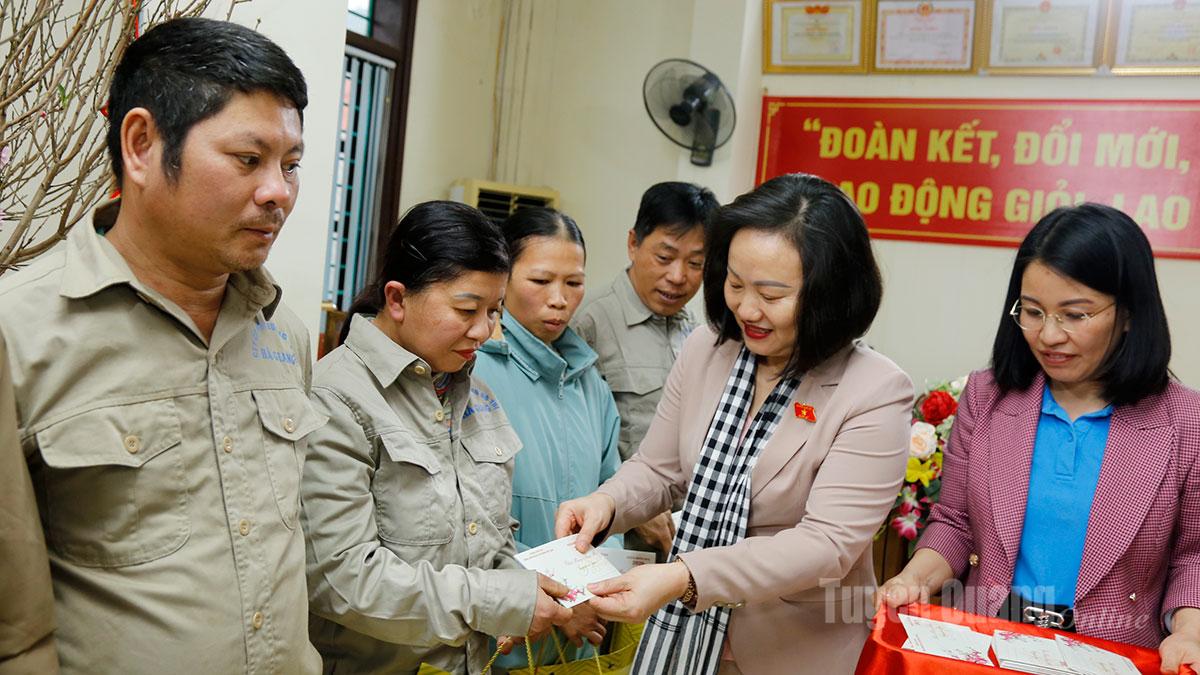 | Đồng chí Phạm Thúy Chinh, Phó Chủ nhiệm Ủy ban Kinh tế và Tài chính của Quốc hội trao quà Tết cho công nhân Công ty Cổ phần Môi trường đô thị Hà Giang. |