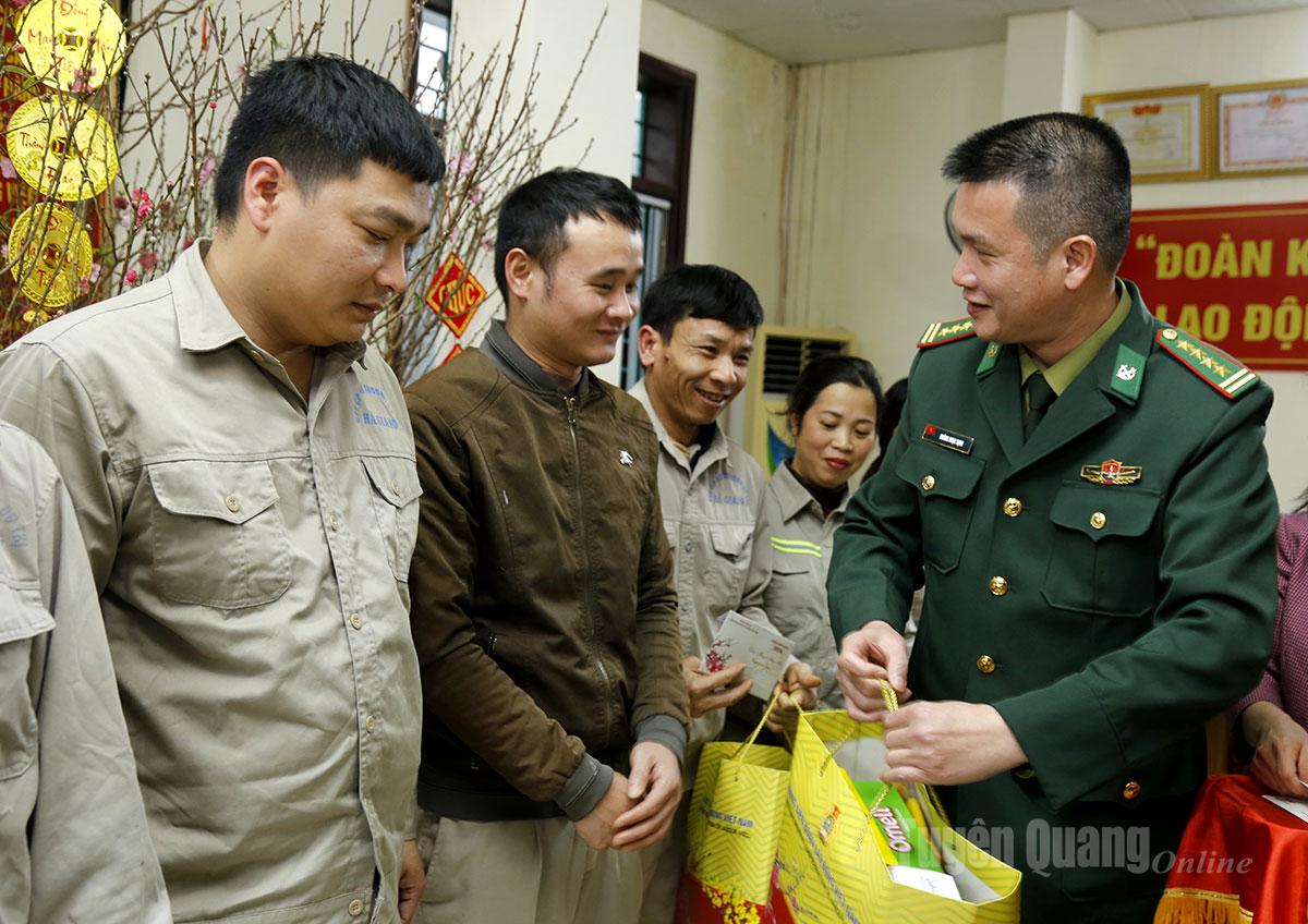 | Đại tá Hoàng Ngọc Định, Phó Chỉ huy trưởng Bộ Chỉ huy Quân sự tỉnh trao quà Tết cho công nhân Công ty Cổ phần Môi trường đô thị Hà Giang. |