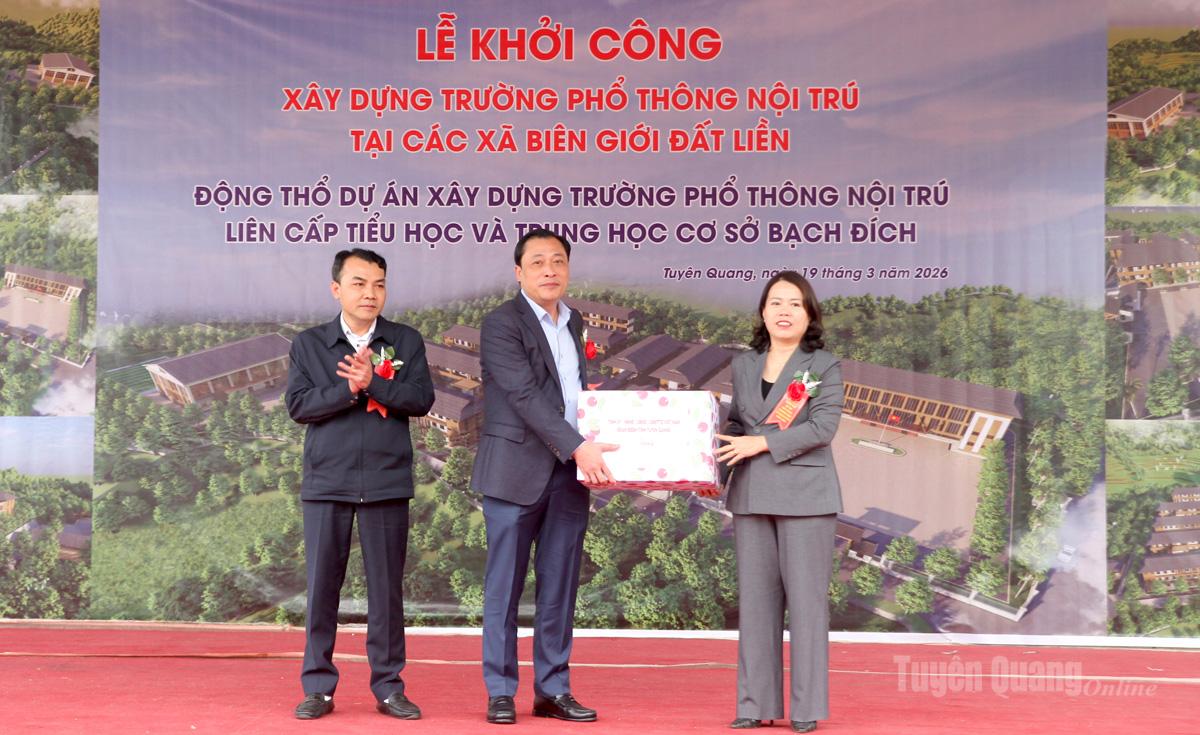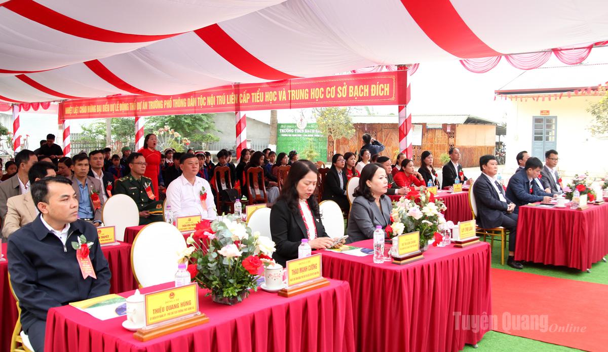 Tại buổi lễ, các đại biểu đã thực hiện nghi thức khởi công công trình trường Phổ thông nội trú liên cấp Tiểu học và Trung học cơ sở Bạch Đích. Dịp này, đồng chí Lý Thị Lan, Trưởng Đoàn đại biểu Quốc hội chuyên trách khóa XV tỉnh Tuyên Quang đã tặng quà cho cấp ủy, chính quyền xã Bạch Đích và đồng chí Mai Đức Thông, Giám đốc Báo và phát thanh, truyền hình Tuyên Quang tặng quà cho trường THCS Bạch Đích.