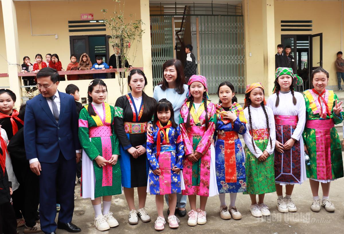 | Phó Chủ tịch HĐND tỉnh Phạm Thị Minh Xuân nói chuyện với học sinh xã Tùng Vài. |