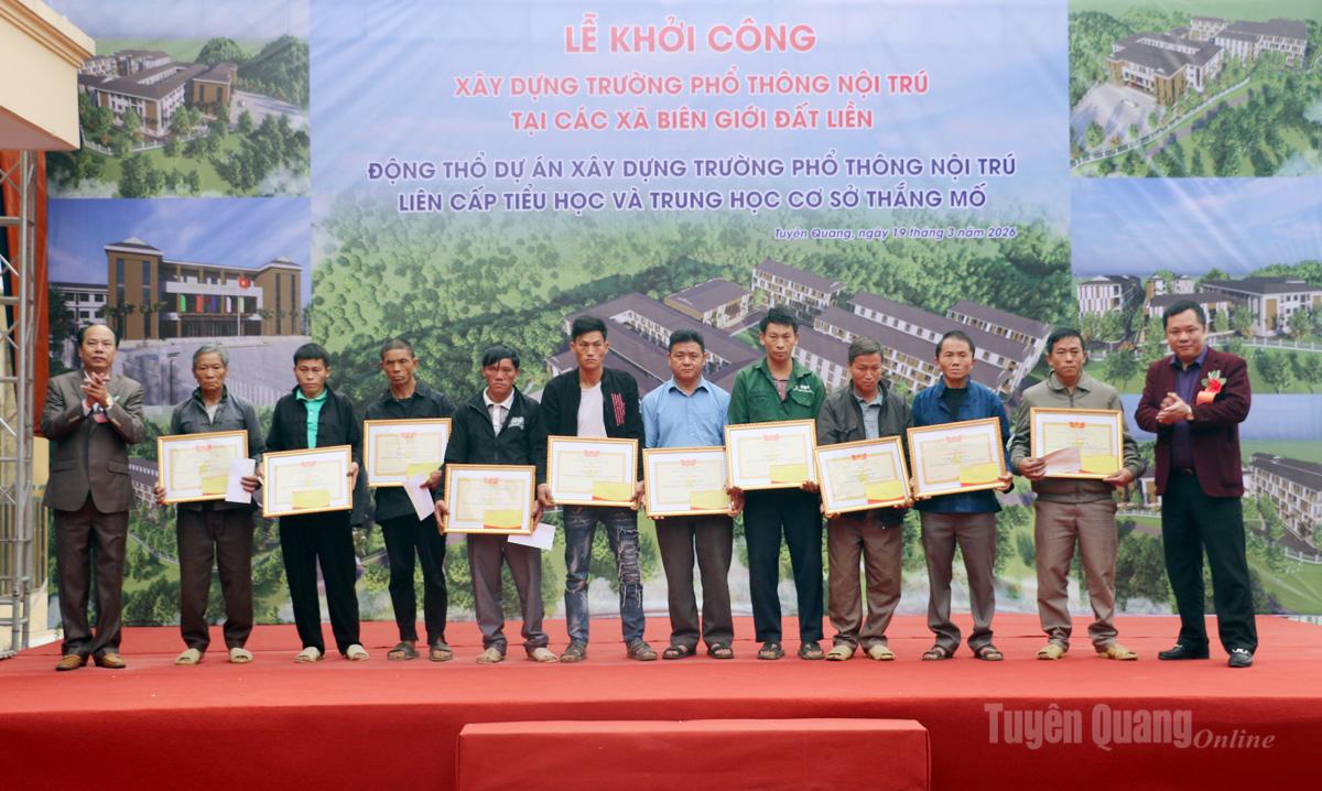 | Lãnh đạo xã Thắng Mố tặng Giấy khen và quà cho 8 hộ hiến đất xây dựng Dự án trường Phổ thông nội trú liên cấp Tiểu học và Trung học cơ sở Thắng Mố. |