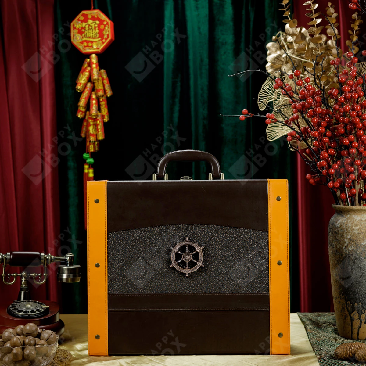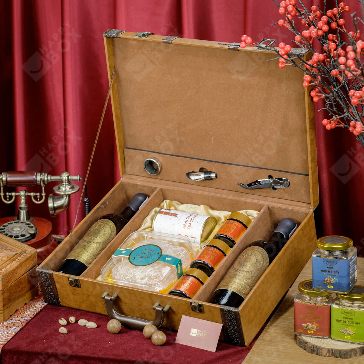 Đây là món quà độc quyền, được chế tác thủ công từ da cao cấp, kết hợp tinh hoa sức khỏe như yến sào, nhân sâm Hàn Quốc, Bào ngư Úc và rượu vang hảo hạng. Mỗi chi tiết đều được chăm chút, thể hiện sự sang trọng, đẳng cấp và gửi gắm thông điệp tài lộc, thịnh vượng cho năm mới.