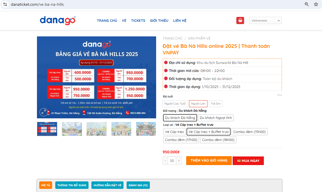 Năm 2025, du lịch trực tuyến đang trở thành xu hướng nổi bật, giúp du khách chủ động lên kế hoạch cho chuyến đi mà không mất nhiều thời gian. Đặc biệt tại Đà Nẵng, Bà Nà Hills là điểm đến hàng đầu, đón lượng lớn khách tham quan mỗi ngày, khiến nhu cầu đặt vé nhanh chóng tăng cao.
