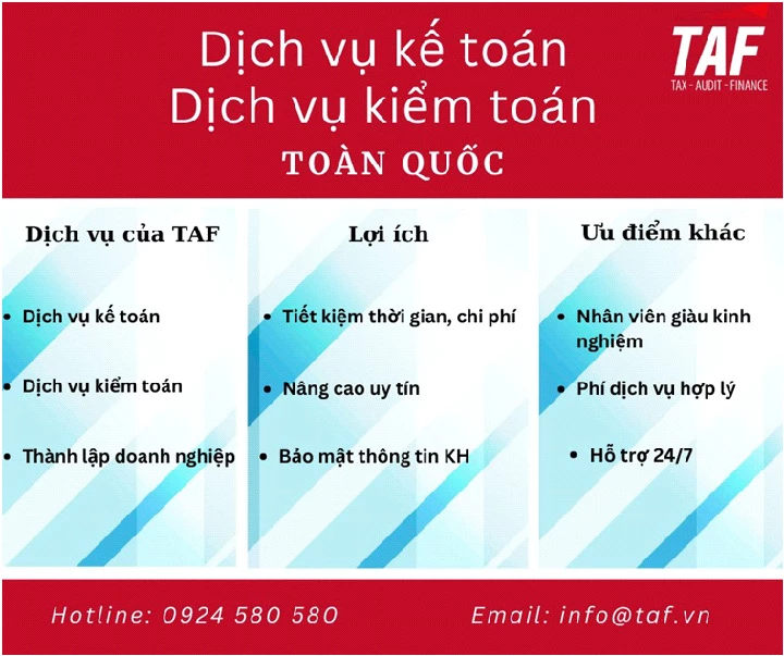 Đến với TAF, doanh nghiệp sẽ được trải nghiệm dịch vụ chuyên nghiệp, tận tâm với chi phí hợp lý nhất trên thị trường. Nếu bạn đang tìm kiếm một đơn vị kế toán, kiểm toán uy tín, chất lượng và giá cả cạnh tranh, đừng bỏ qua TAF – giải pháp tài chính toàn diện cho mọi doanh nghiệp Việt.