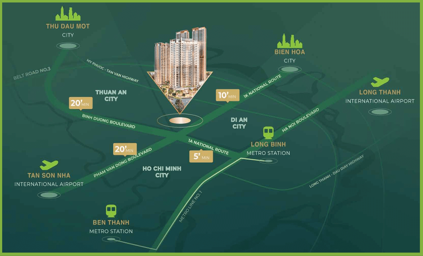 Đây được xem là "trái tim" của tam giác kinh tế TP.HCM – Bình Dương – Đồng Nai. Từ Green Skyline, cư dân nắm giữ trong tay đặc quyền kết nối siêu tốc:
