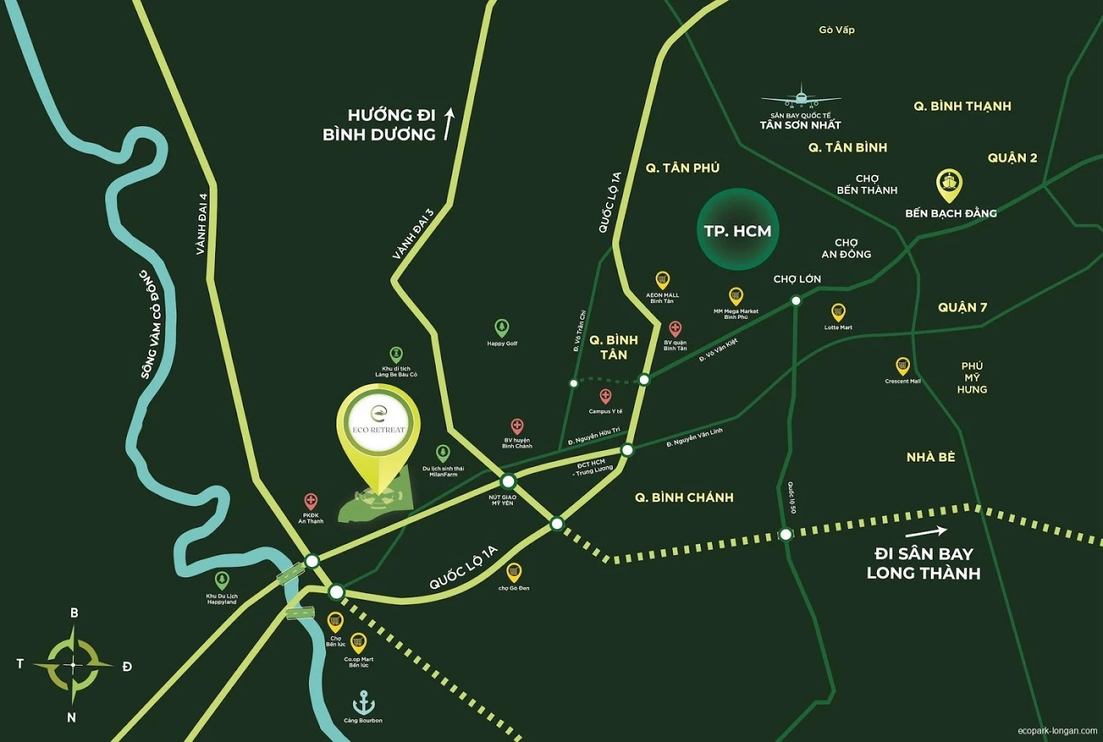 Eco Retreat Long An tọa lạc tại xã Thanh Phú, huyện Bến Lức, tỉnh Long An – vị trí chiến lược nơi cửa ngõ Tây TP.HCM. Chỉ cách trung tâm thành phố khoảng 18km, dự án vừa đảm bảo khả năng kết nối nhanh chóng cho công việc, học tập và giải trí, vừa mang đến không gian sống yên tĩnh, tách biệt khỏi sự ồn ào đô thị.