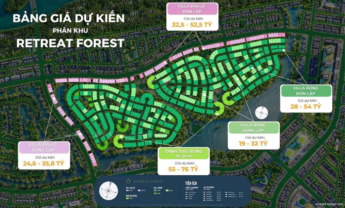 Theo thông tin tham khảo, giá bán Retreat Forest được phân bổ theo từng loại diện tích và thiết kế. Biệt thự rừng song lập có diện tích từ khoảng 220 – 287m², mức giá dao động từ 16 đến 32 tỷ đồng tùy vị trí và có hoặc không tầng hầm. Biệt thự rừng đơn lập diện tích từ 369 – 560m² có giá khoảng 26 – 54 tỷ đồng. Dòng dinh thự Retreat Forest với diện tích gần 600m² có mức giá từ 50 đến hơn 70 tỷ đồng, hướng đến nhóm khách hàng thượng lưu.