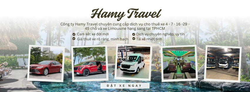Hamy Travel là công ty hoạt động trong lĩnh vực du lịch và vận tải hành khách, chuyên cung cấp dịch vụ thuê xe có tài xế từ 4 chỗ đến 45 chỗ tại TP.HCM và các tỉnh lân cận. Công ty thuê xe Hamy Travel còn giúp hành trình trở nên thuận tiện, tiết kiệm thời gian và mang lại trải nghiệm trọn vẹn hơn cho khách hàng trong mỗi chuyến đi.
