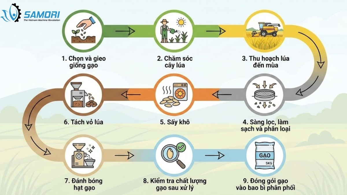 Dưới đây là các bước chi tiết trong quy trình sản xuất gạo chuẩn mực mà bạn nên biết.