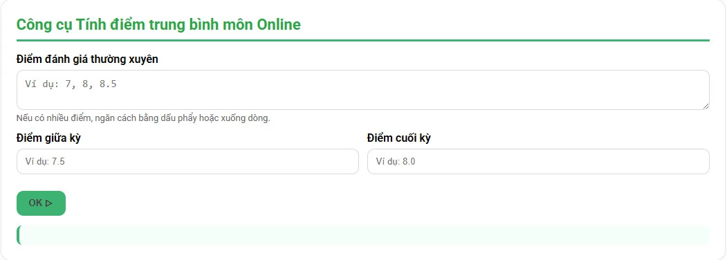 Cách sử dụng: truy cập cách tính điểm trung bình môn tại MaytinhHS → nhập các cột điểm theo từng loại (điểm miệng, 15 phút, 1 tiết, thi học kỳ) → hệ thống tự động áp dụng đúng hệ số → nhận kết quả ĐTB môn chính xác, đã làm tròn đúng quy tắc. Học sinh có thể tính riêng từng học kỳ hoặc tính ĐTB cả năm – tất cả chỉ trong vài giây.