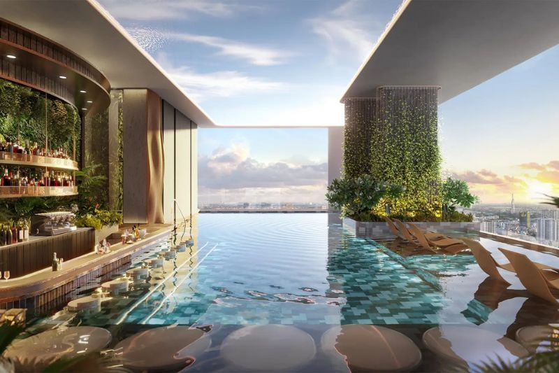 Sky pool vô cực: tọa lạc ở vị trí cao nhất với tầm nhìn panorama 360 độ ôm trọn cảnh quan thành phố. Đây là nơi để cư dân thư giãn, check in và thả mình trong làn nước mát, ngắm nhìn khung cảnh hoàng hôn rực rỡ.