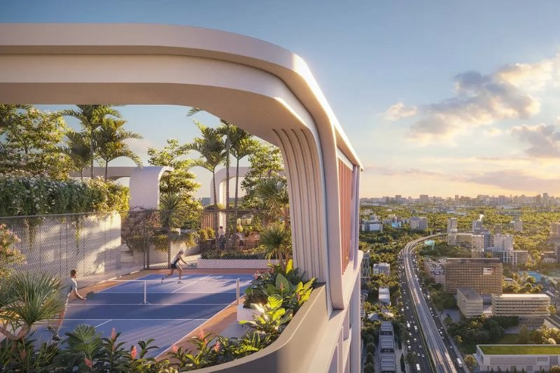 Đáng chú ý có cụm sân Pickleball được bố trí ngay trong khuôn viên, tạo sự kết nối cộng đồng cư dân có gu sống năng động, hiện đại. Khu sky bar tầng thượng siêu chill, tạo cơ hội để cư dân tận hưởng cuộc sống thượng lưu thư thái, nhâm nhi tách cafe hay ly cocktail đậm vị và phóng tầm mắt ôm trọn nhịp sống sôi động của đại lộ hoàng kim.
