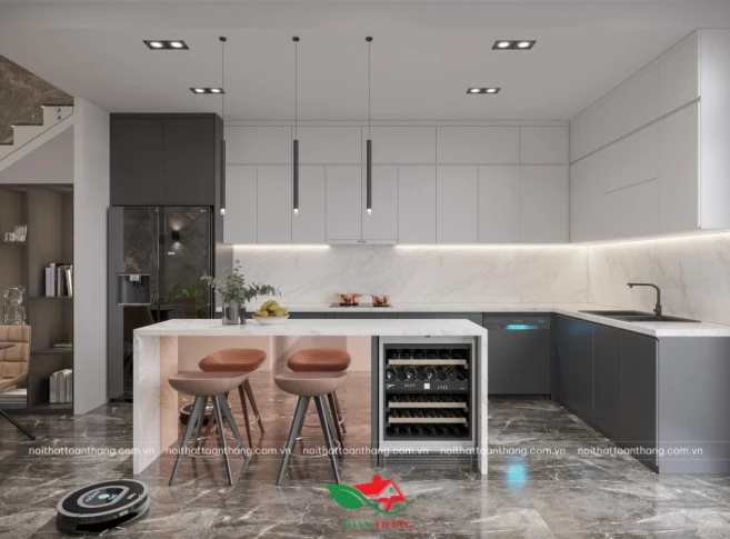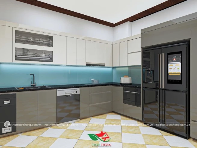 Trong khi đó, cánh Acrylic là loại vật liệu có bề mặt bóng gương, thường được phủ lên lõi gỗ công nghiệp hoặc vật liệu nhựa. Bề mặt này có khả năng phản chiếu ánh sáng tốt, giúp không gian bếp trở nên sáng và rộng hơn. Ngoài ra, cánh Acrylic còn có nhiều màu sắc khác nhau như trắng, xám, đen, kem hoặc các màu vân gỗ, giúp gia chủ dễ dàng lựa chọn theo phong cách nội thất của ngôi nhà.