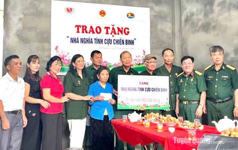 Các đại biểu trao tặng “Nhà nghĩa tình cựu chiến binh” cho ông ông Chu Văn Coỏng, thôn Nhân Thọ 2, xã Yên Nguyên (Chiêm Hóa).