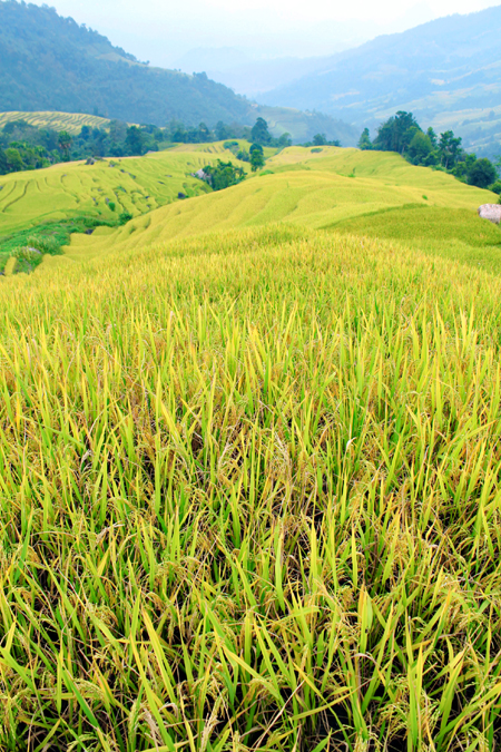 BHG- Vào trung tuần tháng 10, những cánh đồng ruộng bậc thang thuộc 3 thôn vùng cao (Nà Thác, Khuổi My, Lùng Vài) của xã Phương Độ, thành phố Hà Giang, lúa bắt đầu chín rộ. Những thửa ruộng bậc thang chuyển màu vàng óng như mật ong, trải kín nhiều sườn núi của dải Tây Côn Lĩnh, uốn lượn như đường cong của người thiếu nữ… Là điểm nhấn thu hút du khách và người dân thành phố, vào những ngày nghỉ cuối tuần đến tham quan, thưởng ngoạn.