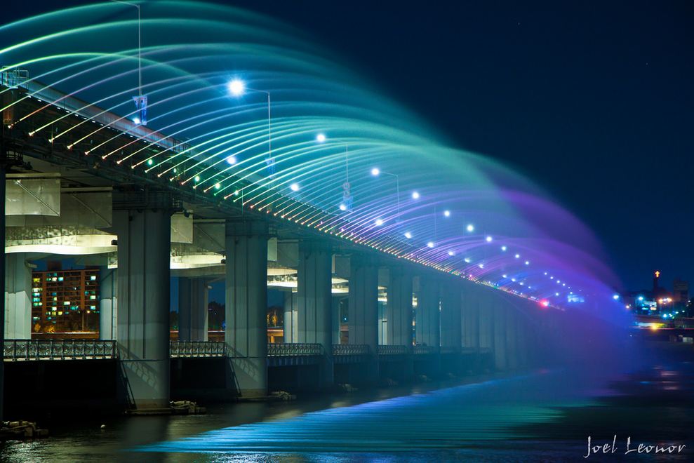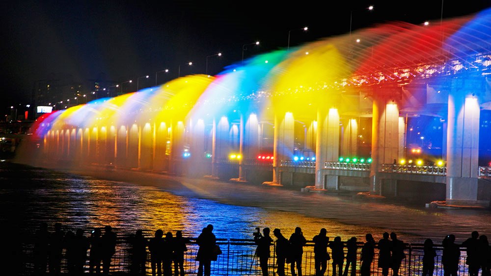 Cầu Banpo ở thành phố Seoul nối liền quận Seocho và quận Yongsan của thủ đô Seoul với kiến trúc hai tầng lạ lẫm khiến du khách cảm thấy thú vị. Cầu có chiều dài hơn 1,4 km, chiều rộng khoảng 40 m, được thiết kế giống một sân khấu nhạc nước với công trình vòi phun nước gắn vào thân cầu. Ngoài ra, cây cầu còn trang bị hệ thống ánh sáng rất tỉ mỉ với 10.000 đèn LED tạo ra 200 mảng màu sắc khác nhau và vẽ ra những dải màu nước dài tới 43m theo chiều ngang. Bởi vậy mà chiếc cầu này còn được người dân xứ sở kim chi gọi bằng cái tên “cầu vồng ánh trăng”