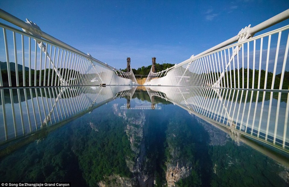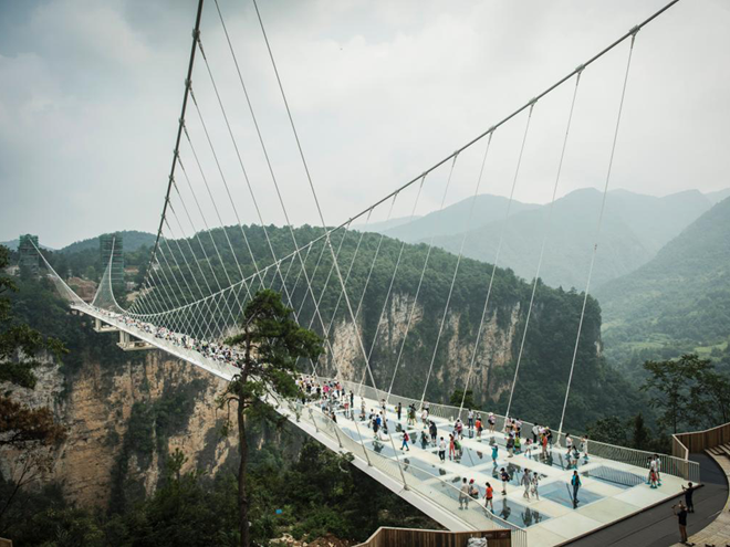 Cây cầu kính này bắc qua hai đỉnh núi ở công viên quốc gia Trương Gia Giới với chiều dài 430 m và nằm ở độ cao 300 m so với mặt đất. Hàng nghìn người đã đổ về đây để trải nghiệm cảm giác đi trên cây cầu kính đáng sợ cao nhất, dài nhất thế giới này.