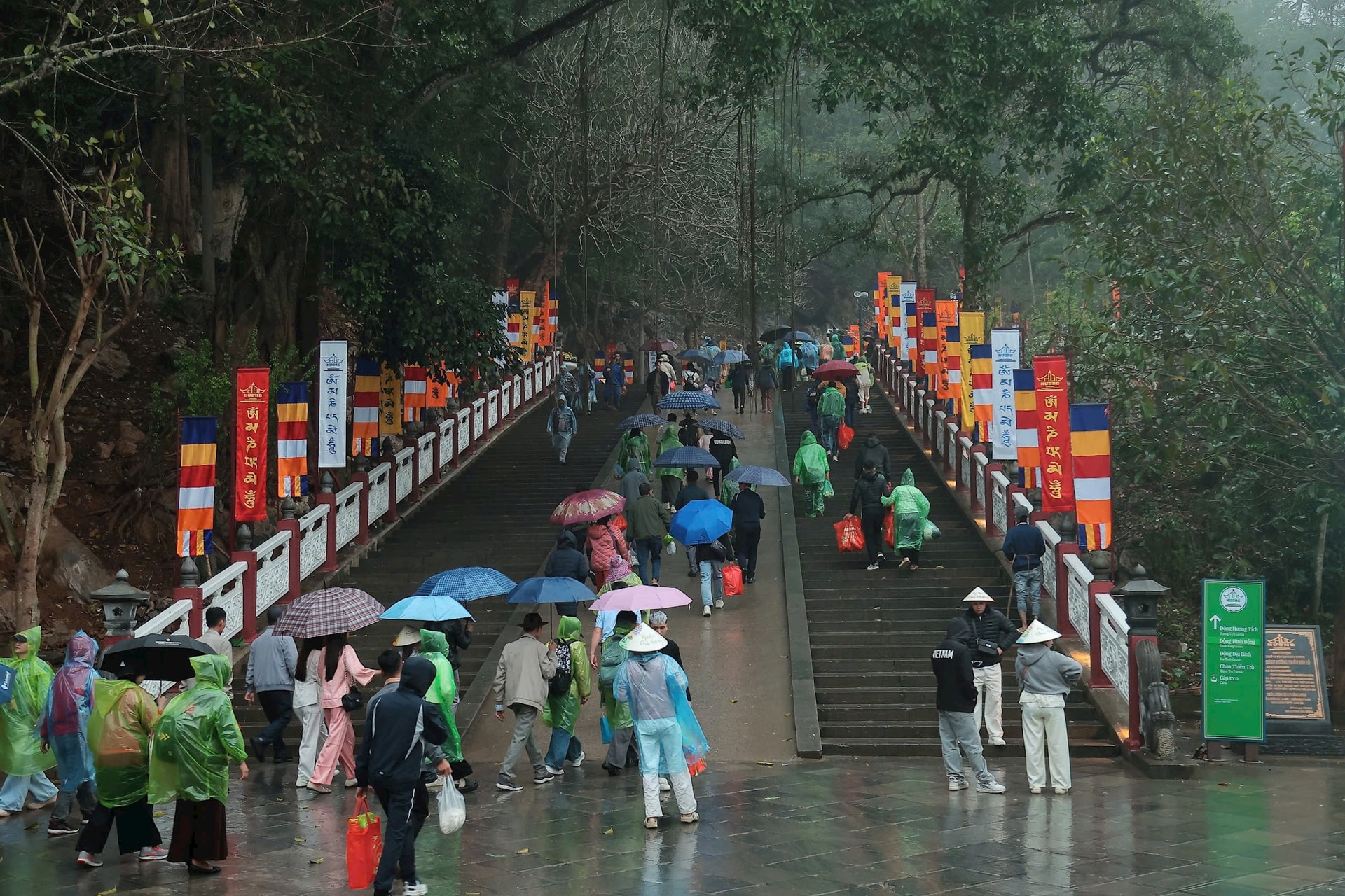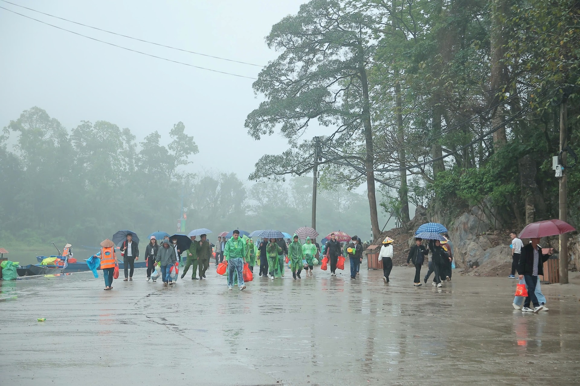 | Mặc dù trong ngày khai hội, trời đổ mưa nhưng lượng người đến chùa Hương rất đông. Ban tổ chức khuyến cáo, nhân dân và du khách nên chọn thời điểm buổi chiều và tối sẽ tránh được ùn tắc hơn. Ảnh: Hoàng Lân |