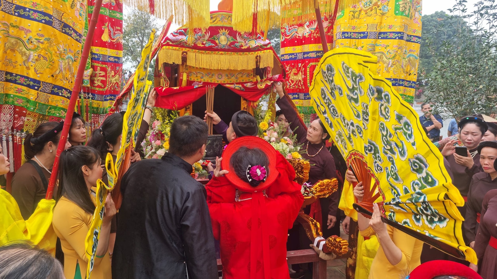 | Nghi lễ rước Mẫu lên kiệu bát cống tại lễ hội Phụng Nghênh. Ảnh: Ánh Dương |