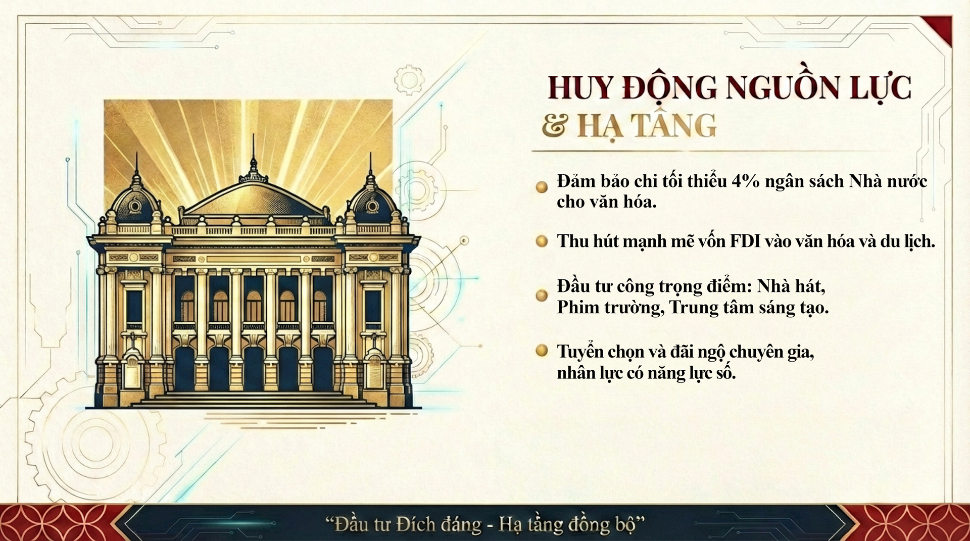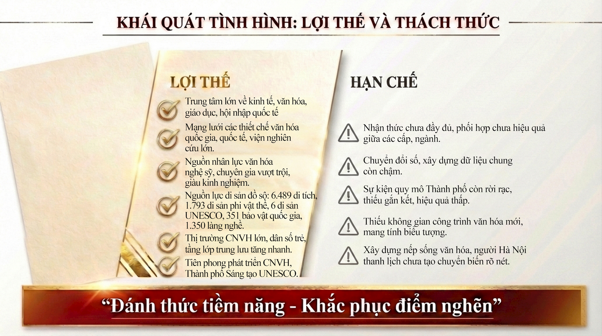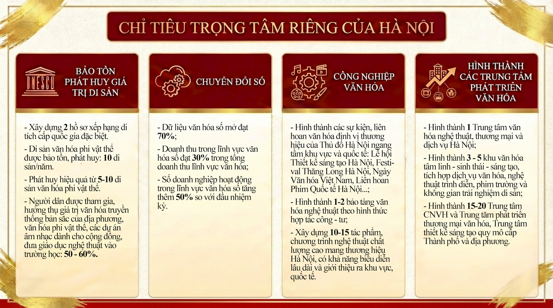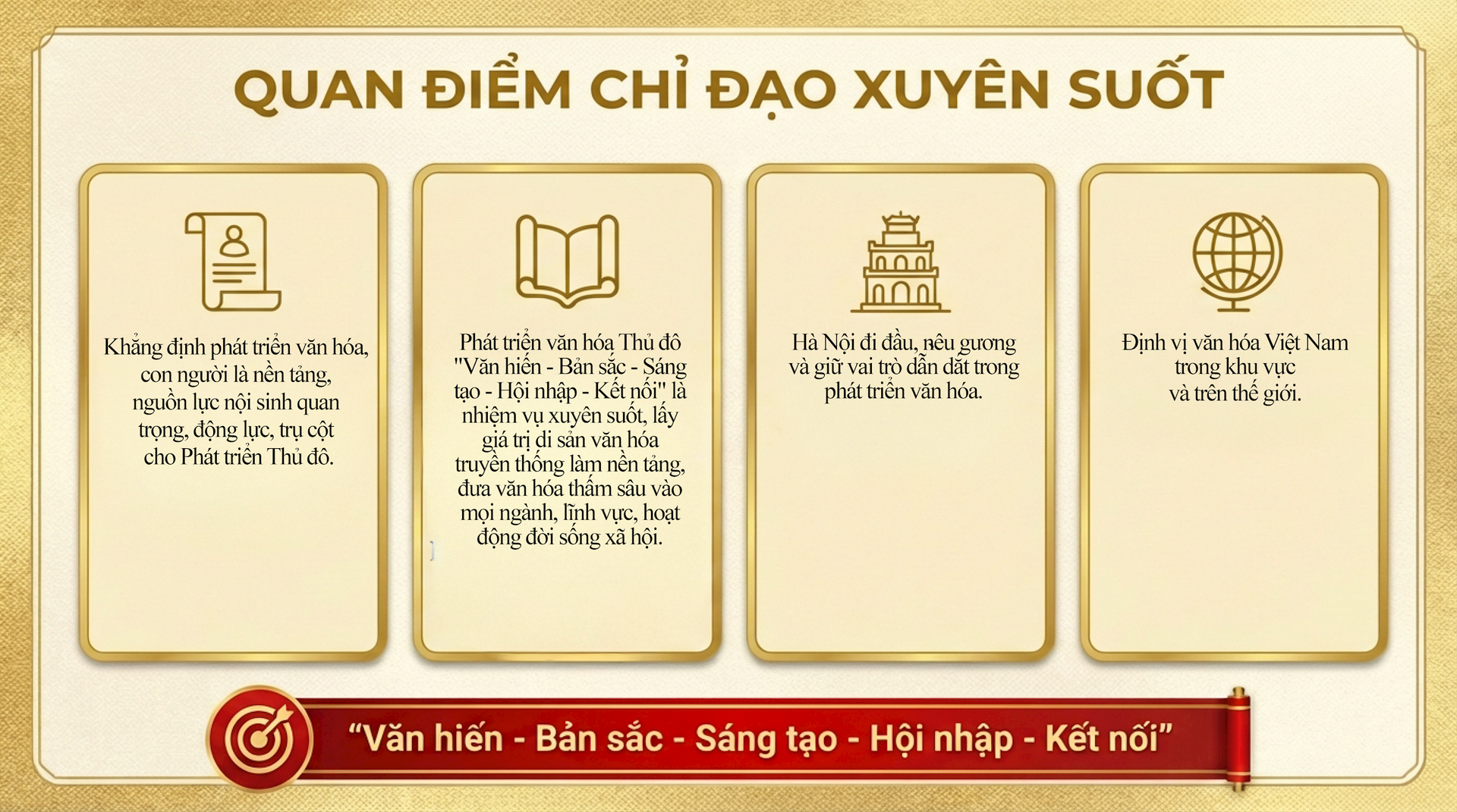 Trên cơ sở phát huy giá trị chiều sâu nghìn năm văn hiến, Hà Nội xác lập định hướng phát triển văn hóa toàn diện, gắn bảo tồn với đổi mới sáng tạo, thúc đẩy công nghiệp văn hóa, xây dựng con người Thủ đô thanh lịch, văn minh và nâng cao sức cạnh tranh, sức hấp dẫn của thành phố trong bối cảnh hội nhập quốc tế sâu rộng.