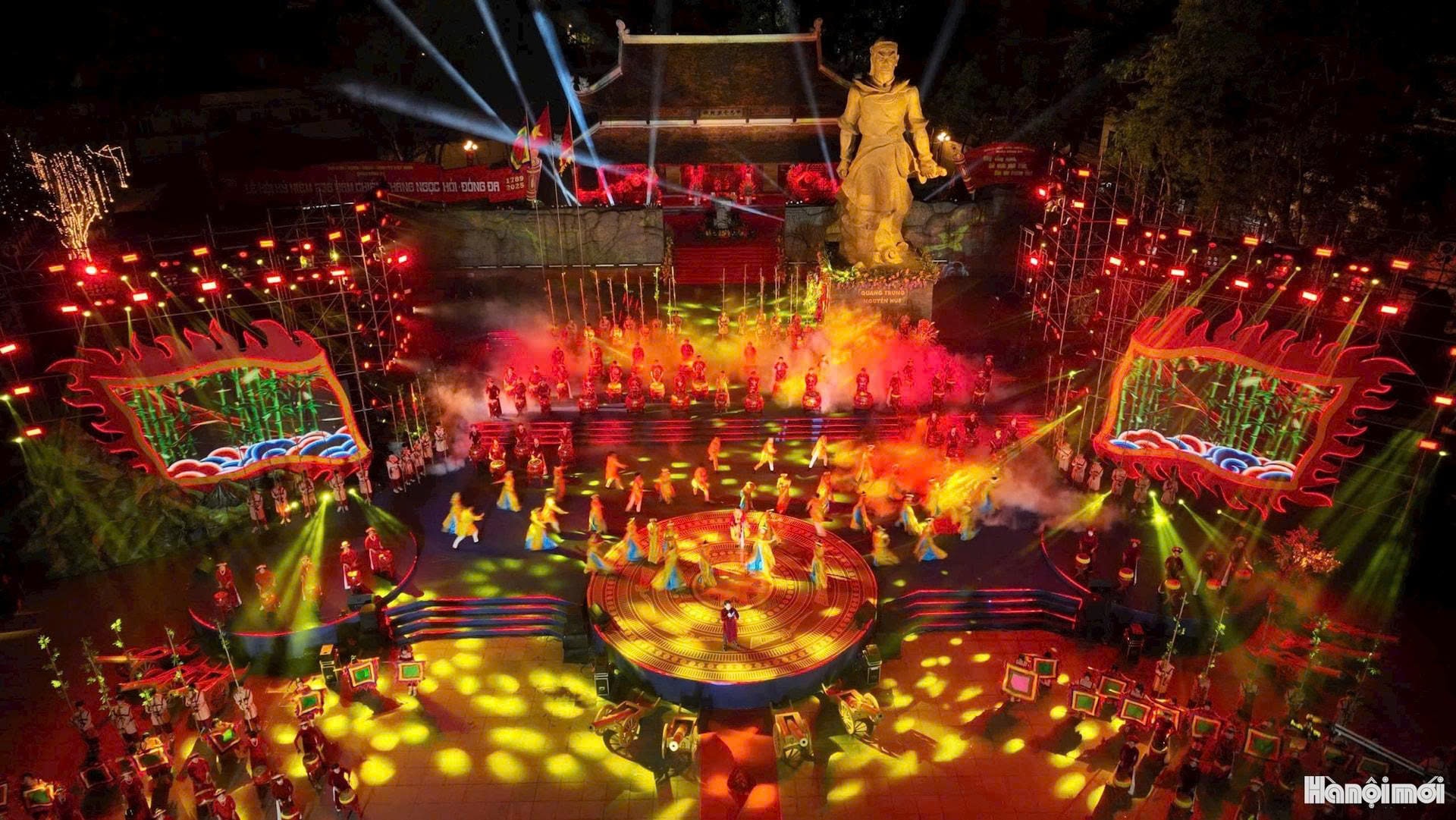| Chương trình nghệ thuật “Đống Đa - Sử vàng lưu danh - Tương lai vững bước” được thể hiện bằng hình thức bán thực cảnh kết hợp công nghệ 3D mapping hiện đại tại Lễ hội gò Đống Đa. Ảnh: Viết Thành |