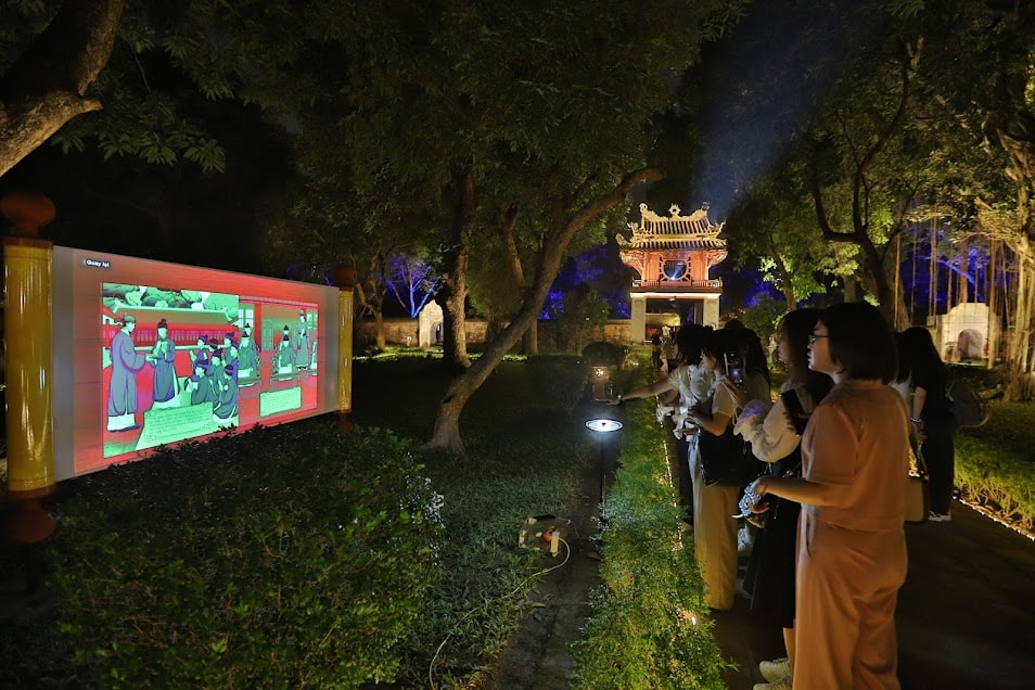 | Du khách trải nghiệm tour du lịch đêm "Tinh hoa đạo học" tại di tích Văn Miếu - Quốc Tử Giám. Ảnh: Khánh Huy |